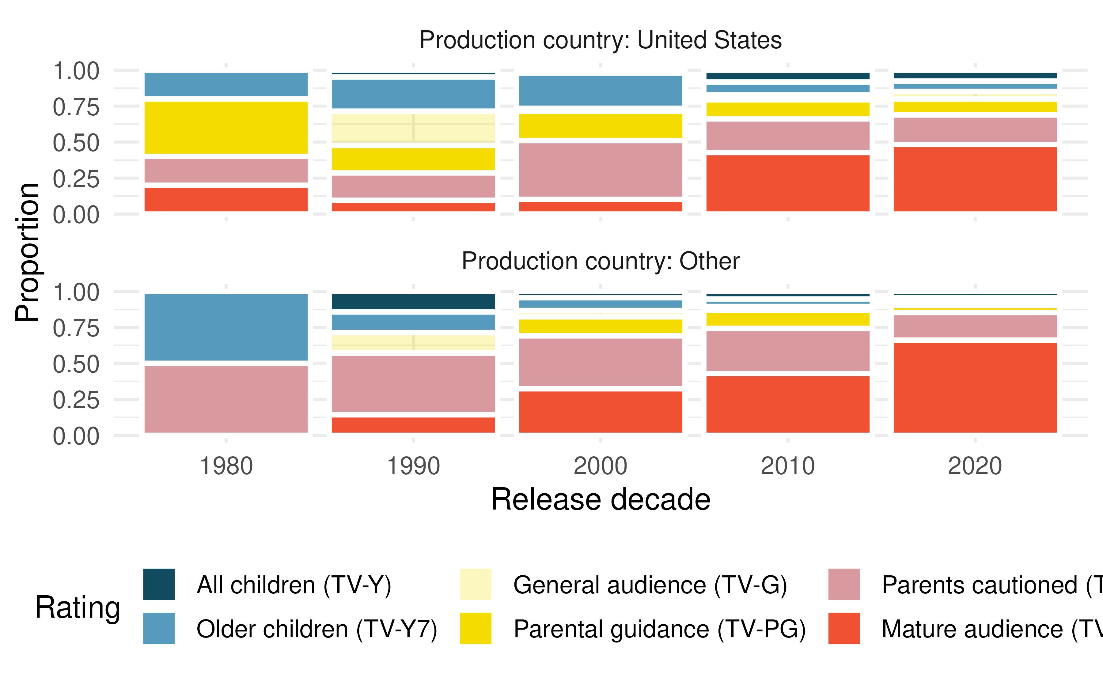 Shows on Netflix. The visualization below shows the distribution of ratings of TV shows on Netflix (a streaming entertainment service) based on the decade they were released in and the country they were produced in. In the dataset, each observation is a TV show.22