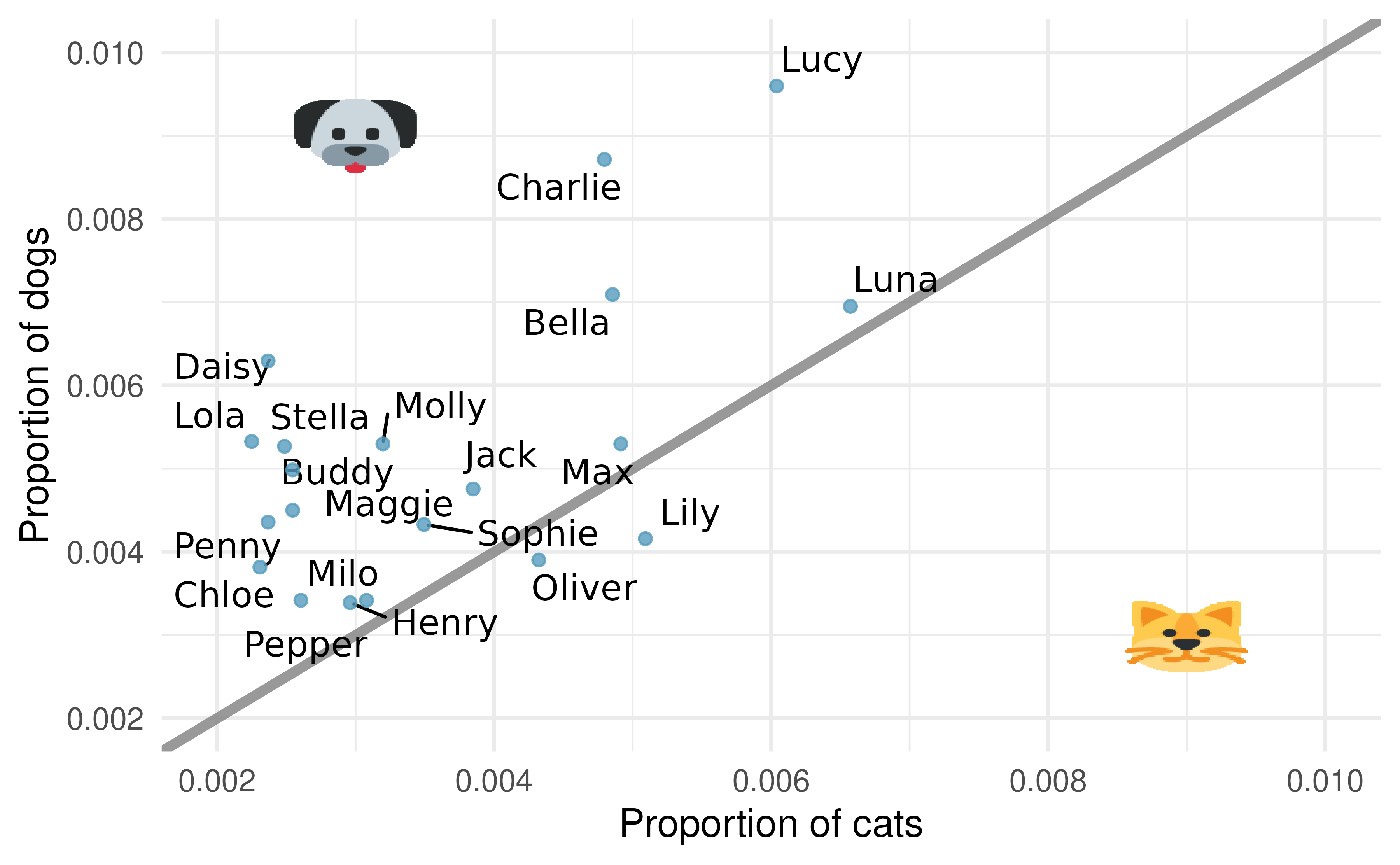 Pet names. The city of Seattle, WA has an open data portal that includes pets registered in the city. For each registered pet, we have information on the pet’s name and species. The following visualization plots the proportion of dogs with a given name versus the proportion of cats with the same name. The 20 most common cat and dog names are displayed. The diagonal line on the plot is the \(x = y\) line; if a name appeared on this line, the name’s popularity would be exactly the same for dogs and cats.24