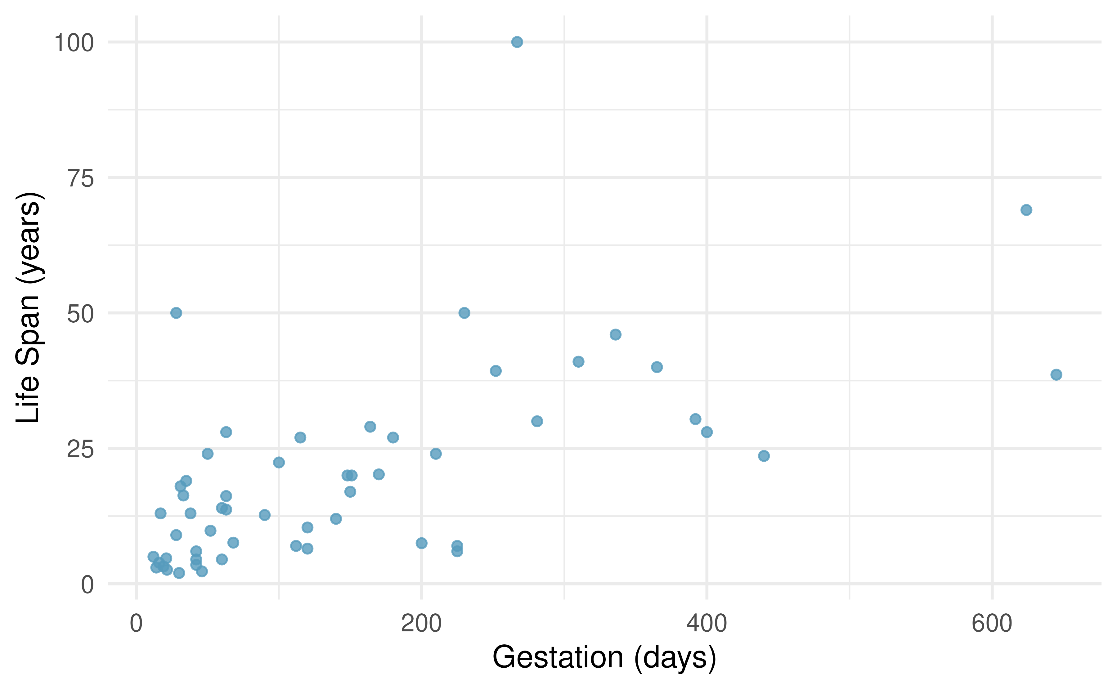 Mammal life spans. Data were collected on life spans (in years) and gestation lengths (in days) for 62 mammals. A scatterplot of life span versus length of gestation is shown below.63 (Allison and Cicchetti 1975)