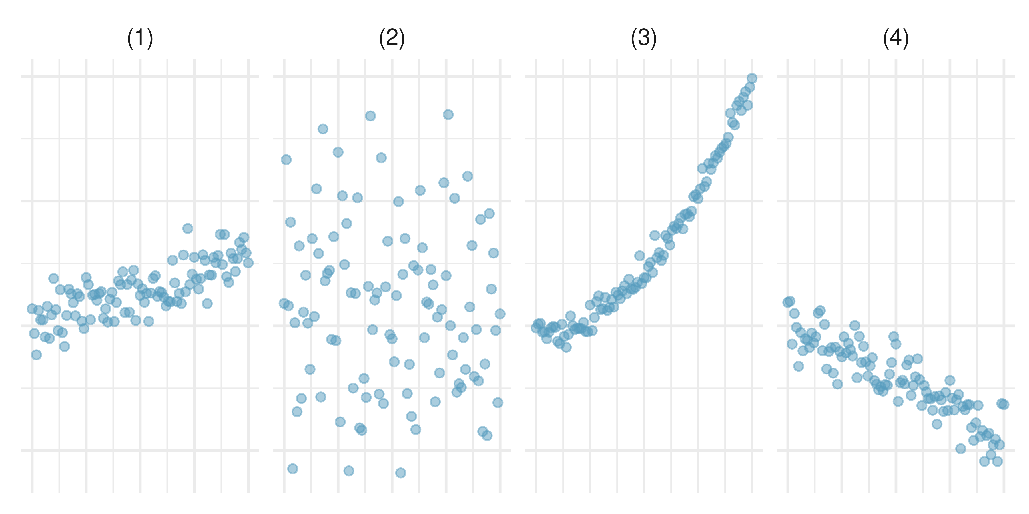 Associations. Indicate which of the plots show (a) a positive association, (b) a negative association, or (c) no association. Also determine if the positive and negative associations are linear or nonlinear. Each part may refer to more than one plot.