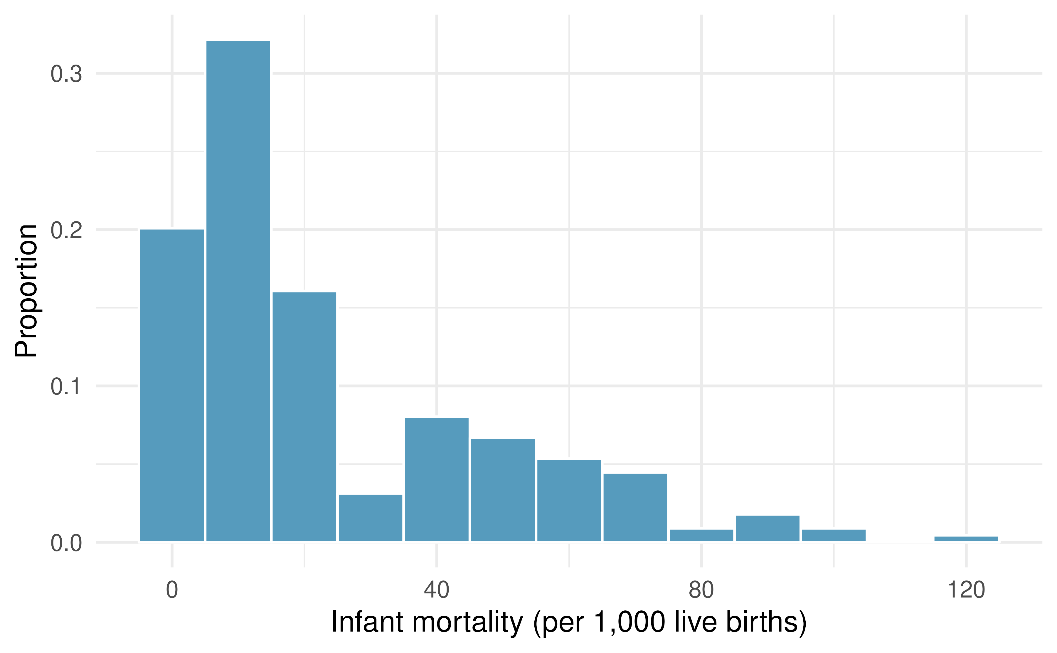 Infant mortality. The infant mortality rate is defined as the number of infant deaths per 1,000 live births. This rate is often used as an indicator of the level of health in a country. The relative frequency histogram below shows the distribution of estimated infant death rates for 224 countries for which such data were available in 2014.64