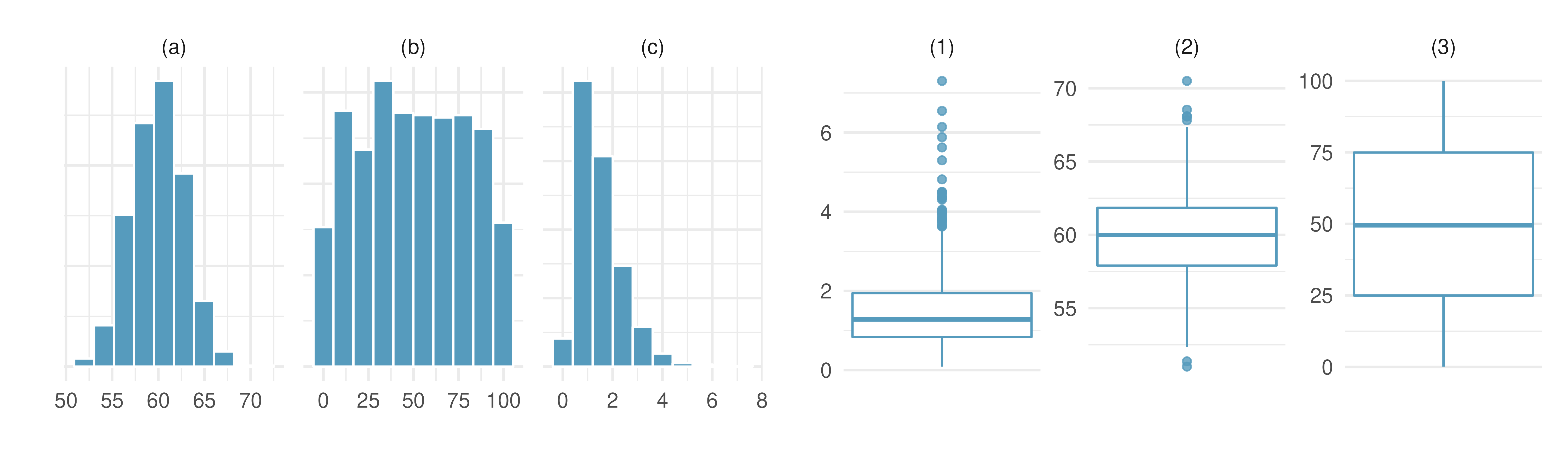 Histograms and box plots. Describe (in words) the distribution in the histograms below and match them to the box plots.