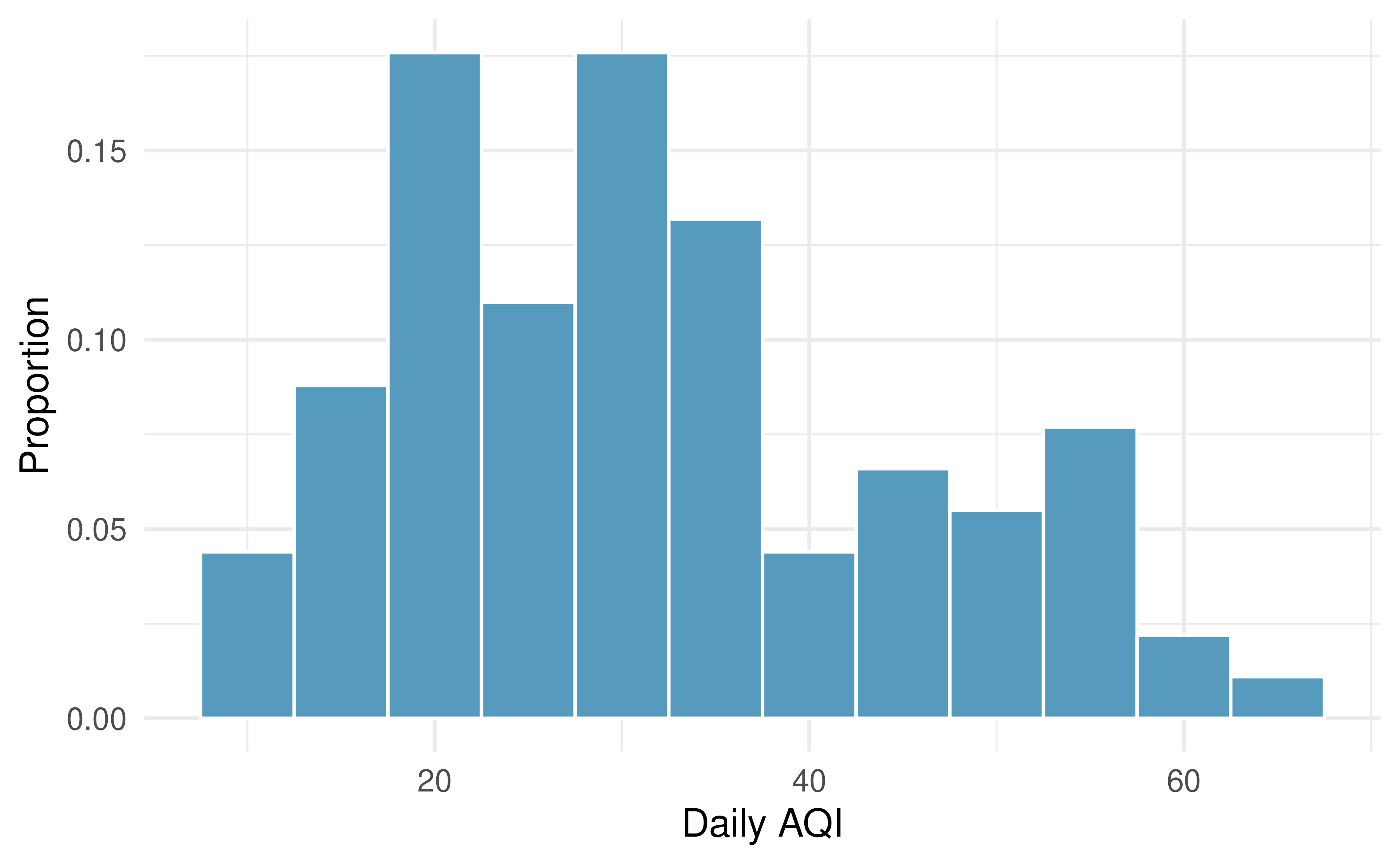 Air quality. Daily air quality is measured by the air quality index (AQI) reported by the Environmental Protection Agency. This index reports the pollution level and what associated health effects might be a concern. The index is calculated for five major air pollutants regulated by the Clean Air Act and takes values from 0 to 300, where a higher value indicates lower air quality. AQI was reported for a sample of 91 days in 2011 in Durham, NC. The histogram below shows the distribution of the AQI values on these days.65