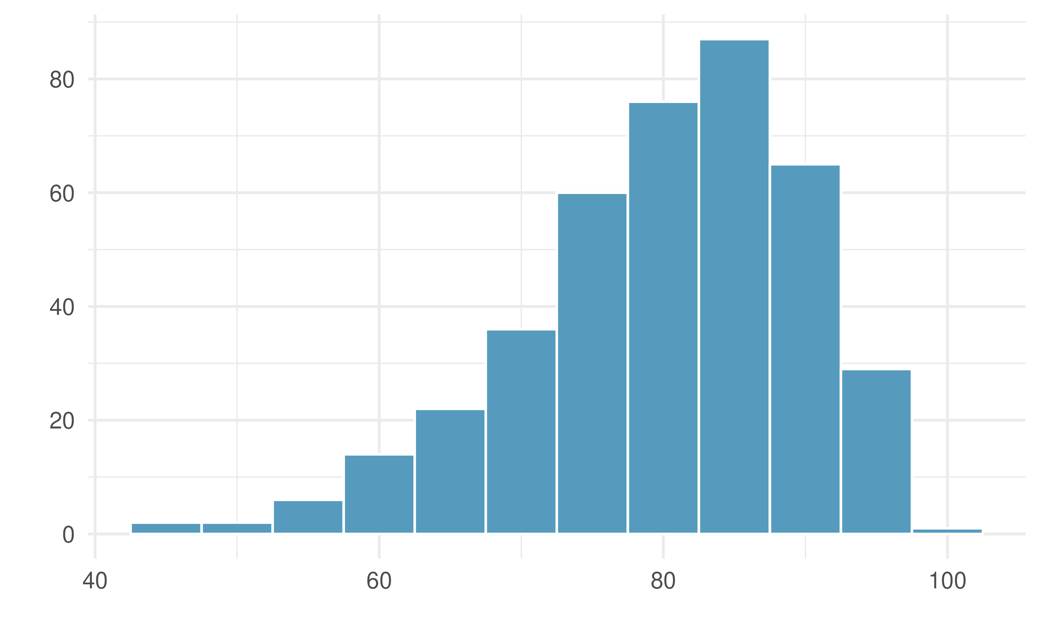 Note that the histogram resembles a more heavily binned version of the stacked dot plot shown in Figure 4.3.