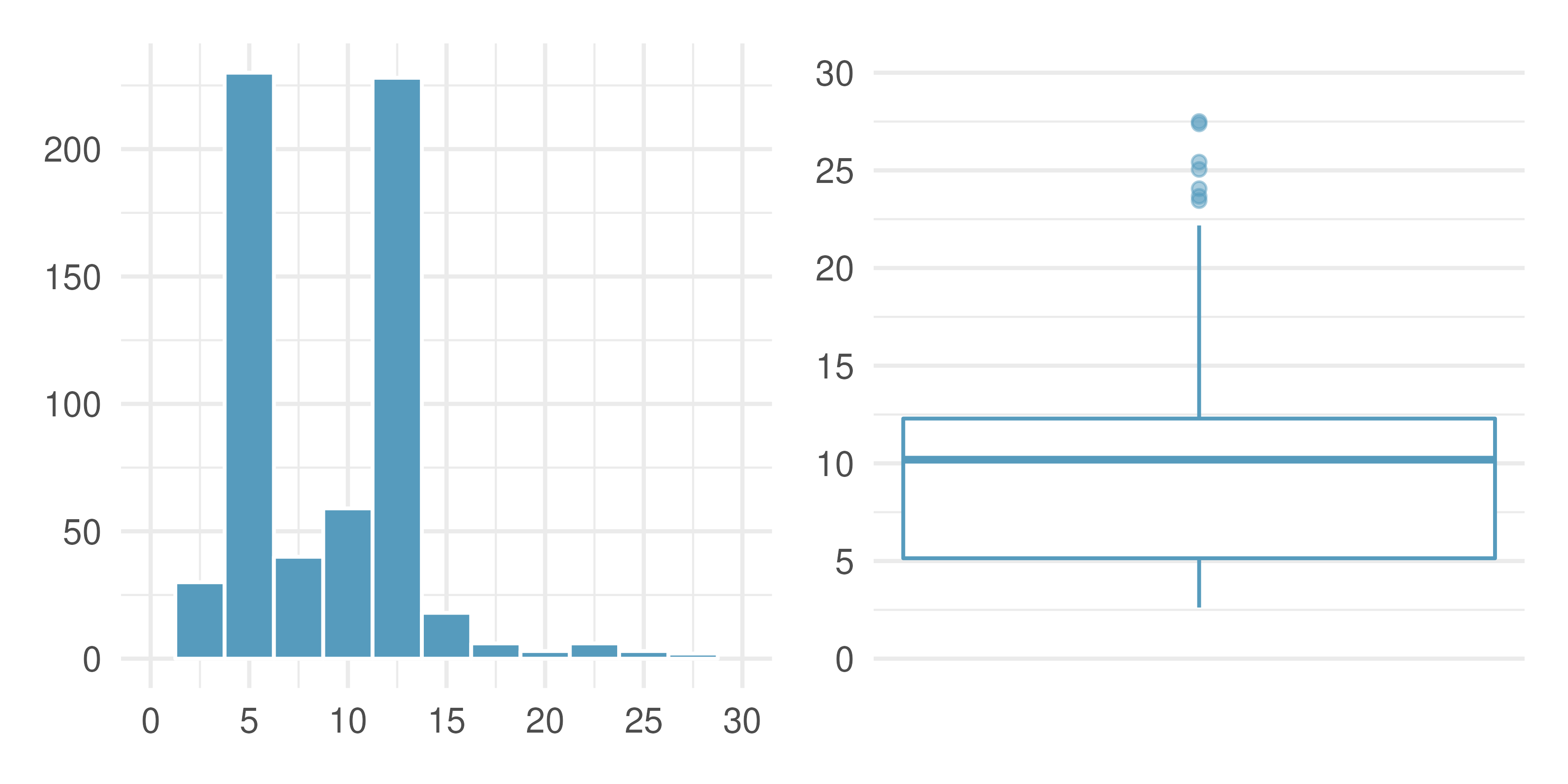 Histograms vs. box plots. Compare the two plots below. What characteristics of the distribution are apparent in the histogram and not in the box plot? What characteristics are apparent in the box plot but not in the histogram?