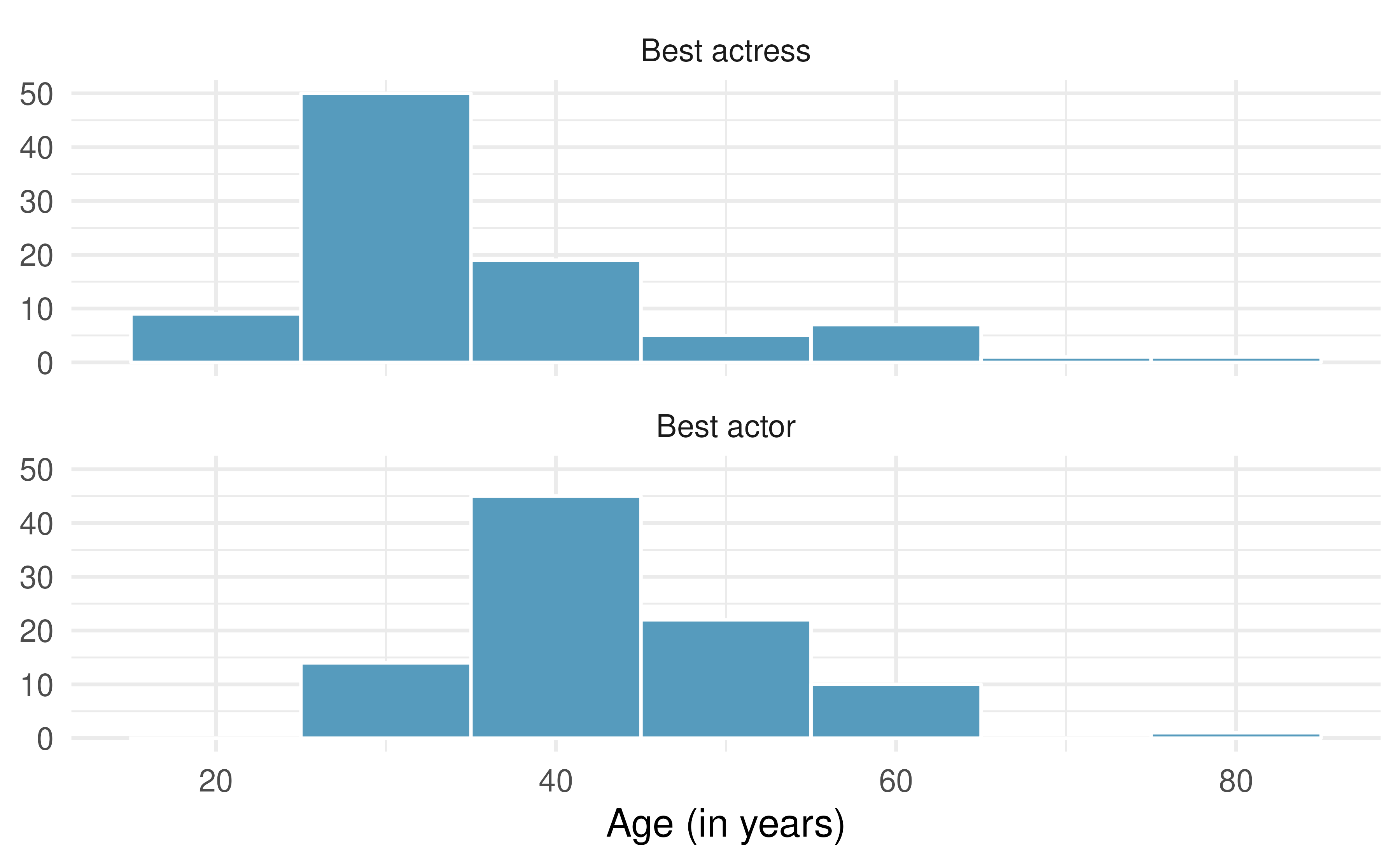 Oscar winners. The first Oscar awards for best actor and best actress were given out in 1929. The histograms below show the age distribution for all of the best actor and best actress winners from 1929 to 2019. Summary statistics for these distributions are also provided. Compare the distributions of ages of best actor and actress winners.66
