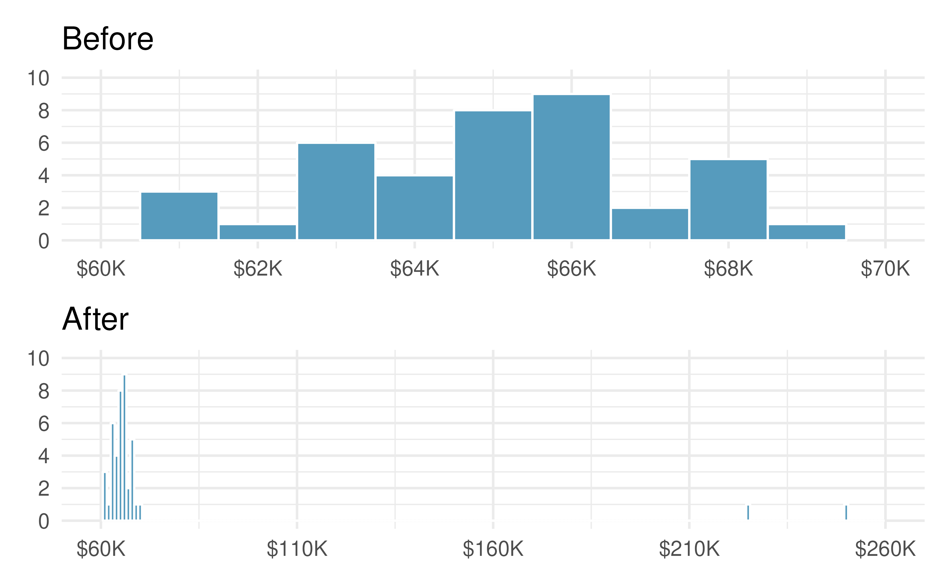 Income at the coffee shop. The first histogram below shows the distribution of the yearly incomes of 40 patrons at a college coffee shop. Suppose two new people walk into the coffee shop: one making $225,000 and the other $250,000. The second histogram shows the new income distribution. Summary statistics are also provided, rounded to the nearest whole number.