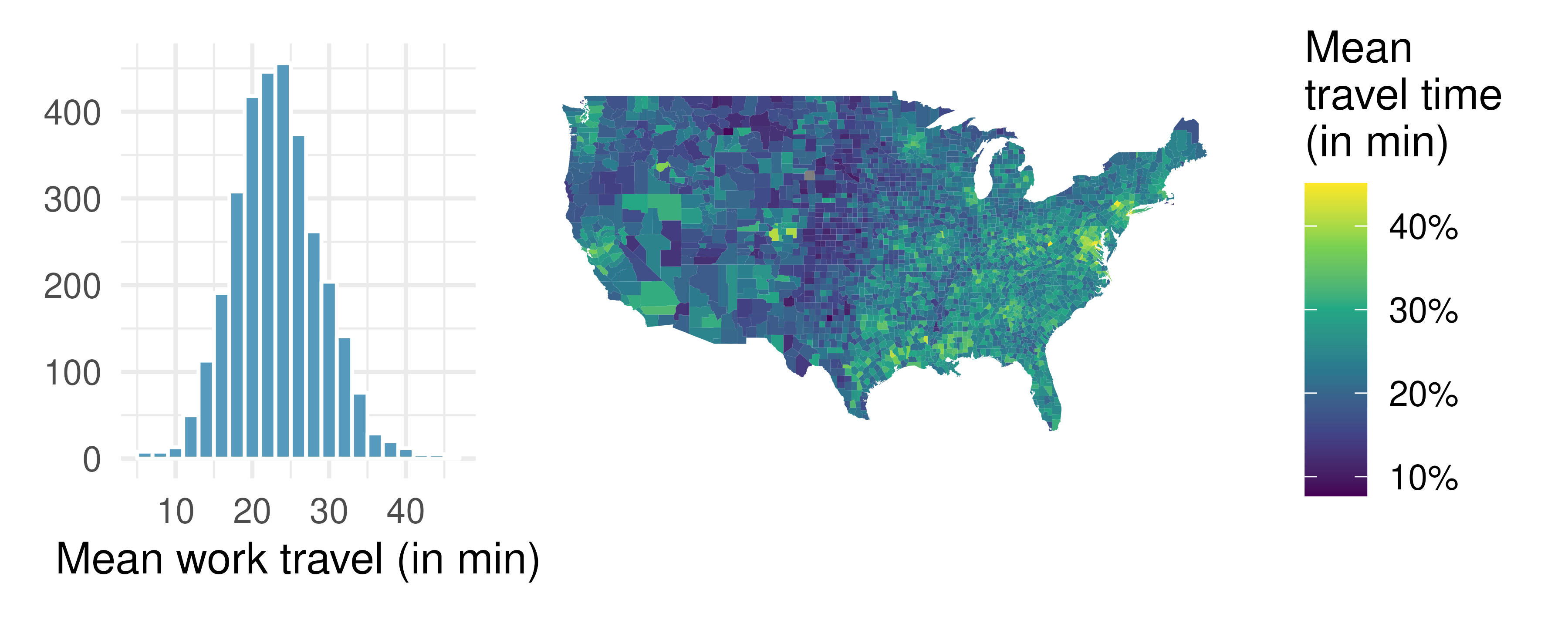 Commute times. The US census collects data on the time it takes Americans to commute to work, among many other variables. The histogram below shows the distribution of average commute times in 3,142 US counties in 2017. Also shown below is a spatial intensity map of the same data.67