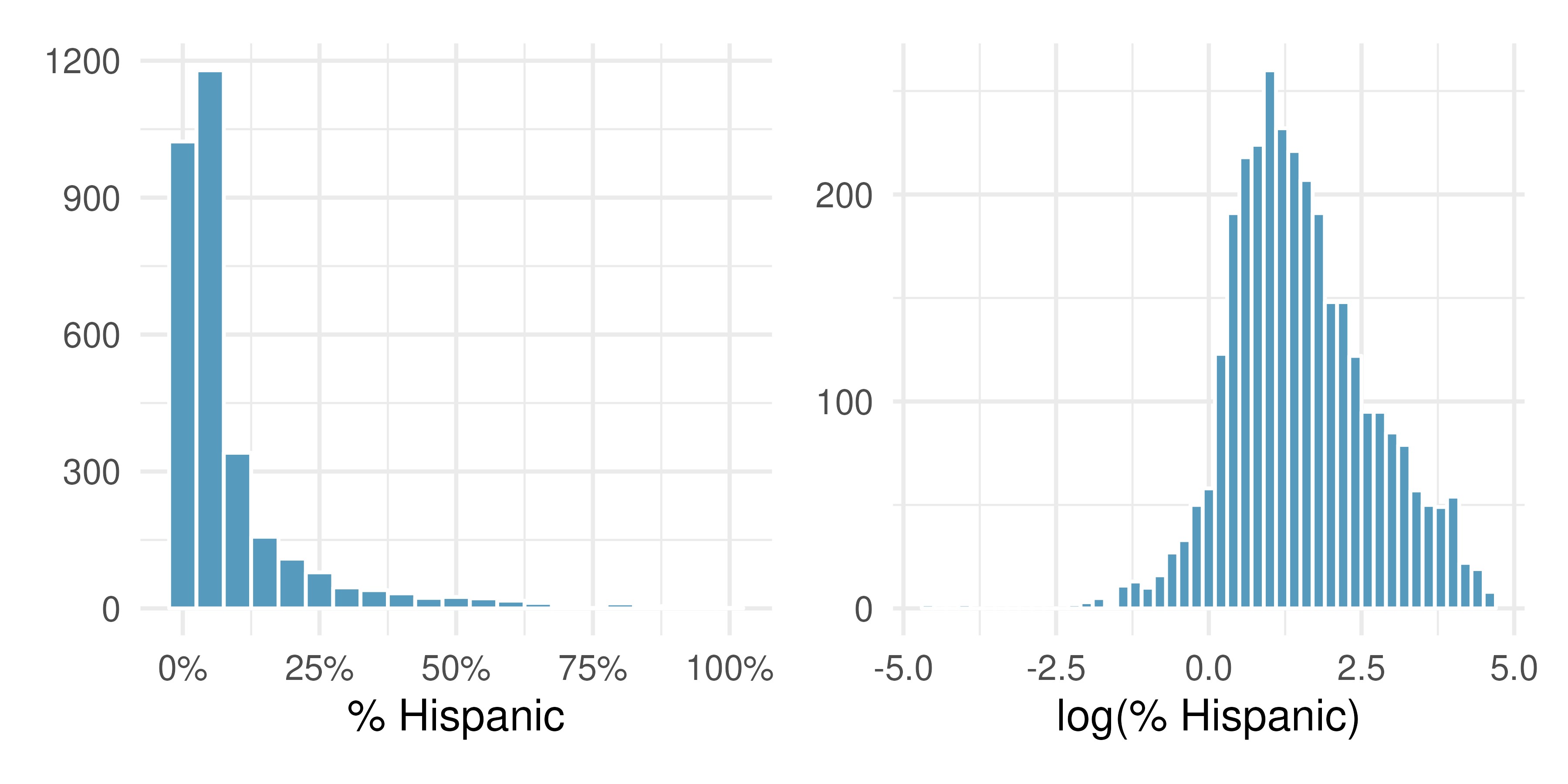 Hispanic population. The US census collects data on race and ethnicity of Americans, among many other variables. The histogram below shows the distribution of the percentage of the population that is Hispanic in 3,142 counties in the US in 2010. Also shown is a histogram of logs of these values.68