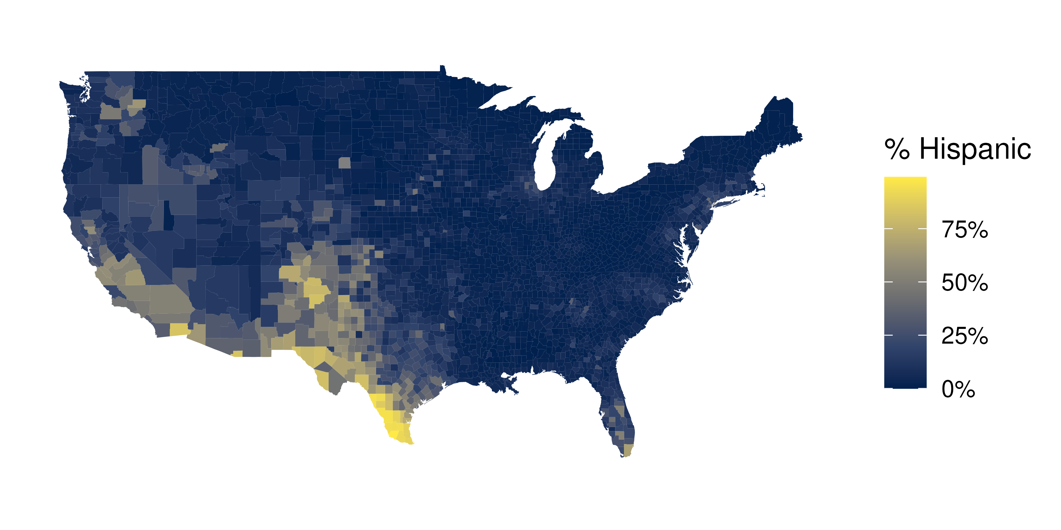 What features of the distribution of the Hispanic population in US counties are apparent in the map but not in the histogram? What features are apparent in the histogram but not the map?