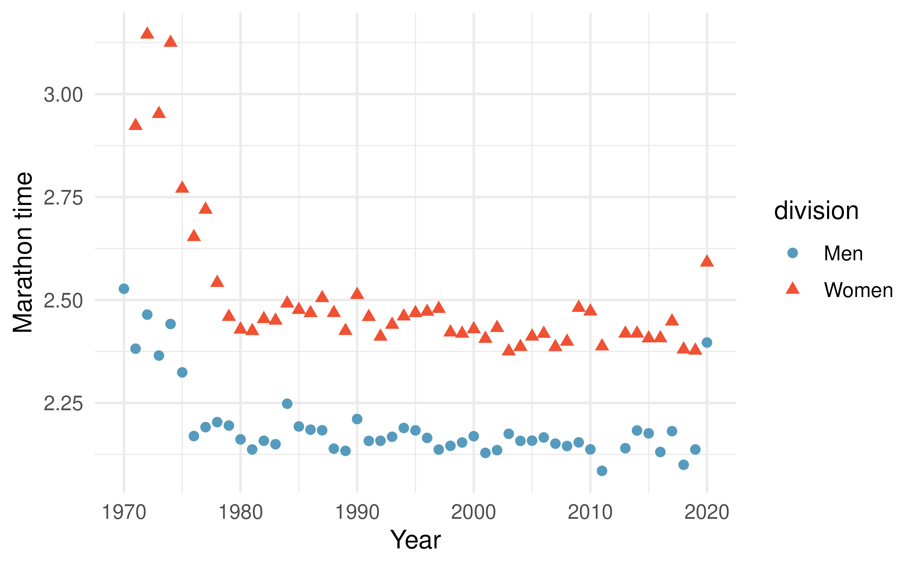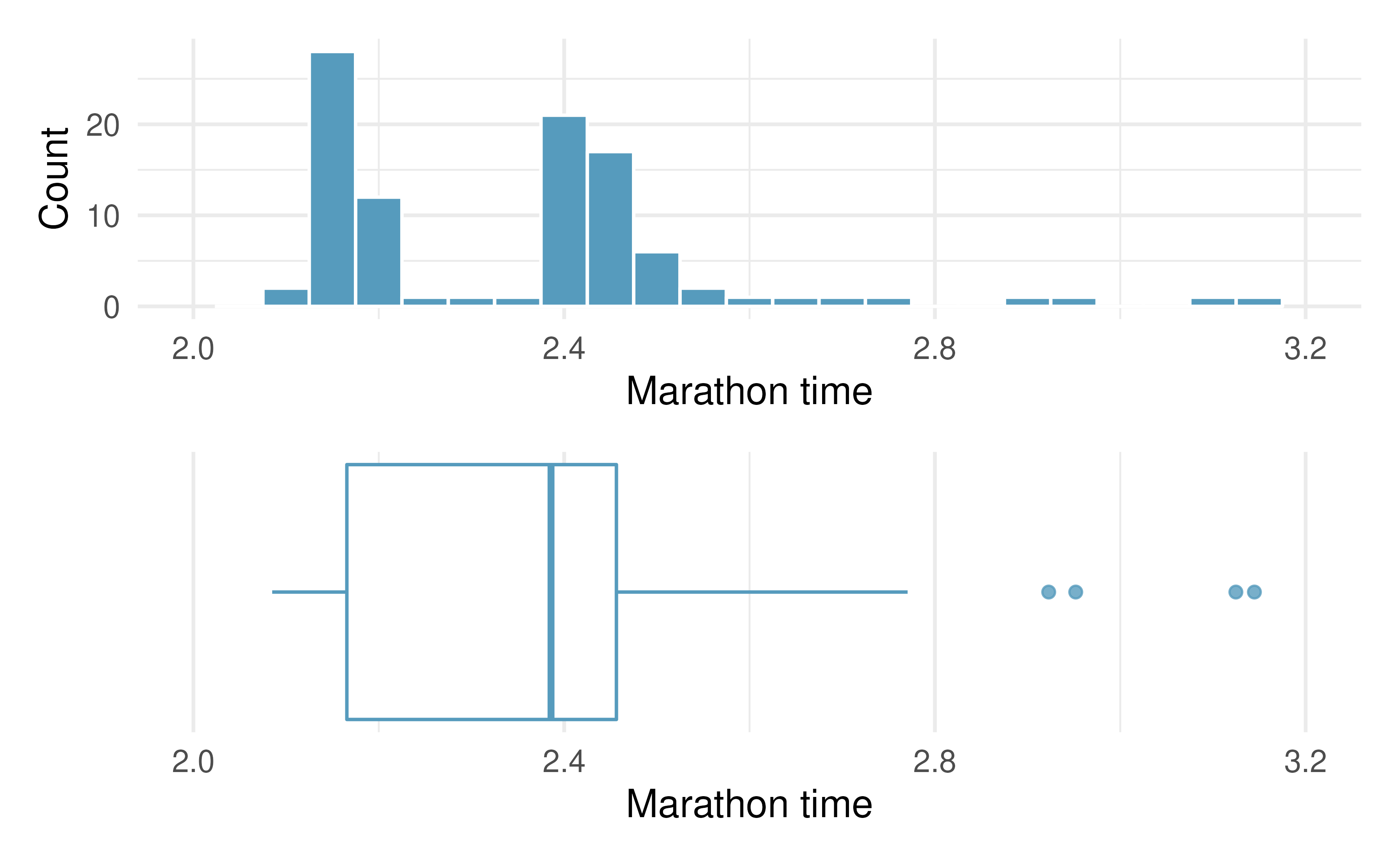 NYC marathon winners. The histogram and box plots below show the distribution of finishing times for male and female winners of the New York City Marathon between 1970 and 2020.69
