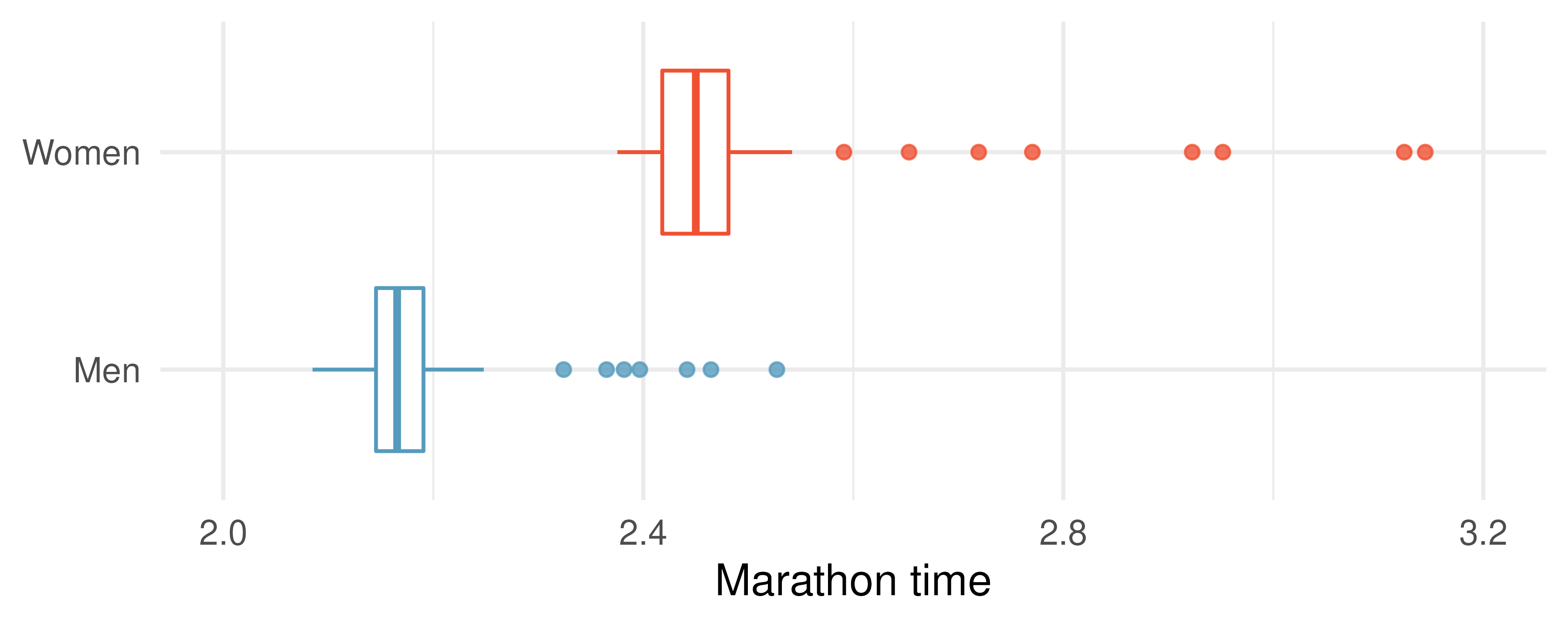 Compare the distribution of marathon times for men and women based on the box plot shown below.