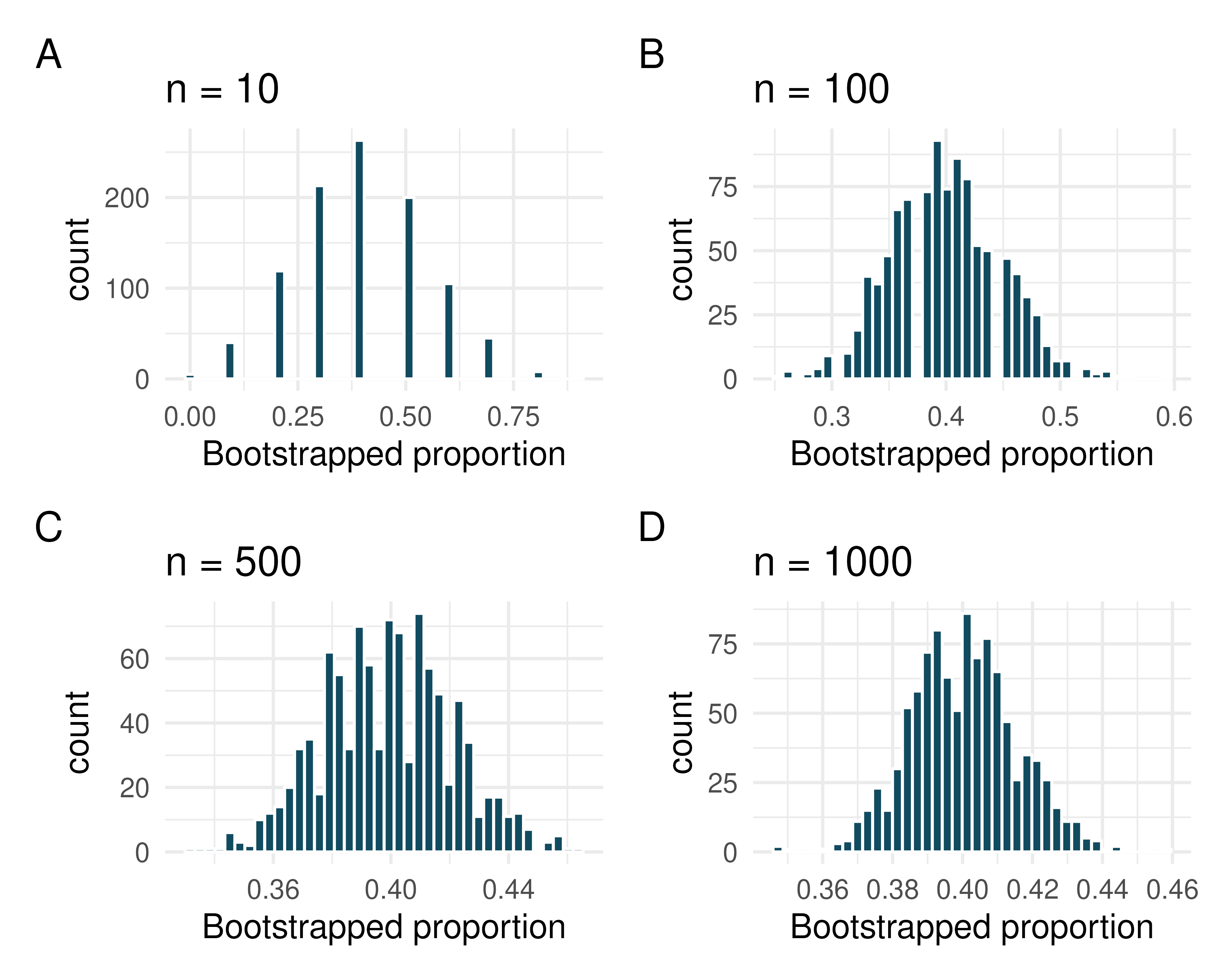Bootstrap distributions of \(\hat{p}\), III. Each of the following four distributions was created using a different dataset. Each dataset had the same proportion of successes \((\hat{p} = 0.4)\) but a different sample size. The four datasets were given by \(n = 10, 100, 500\), and \(1000\).