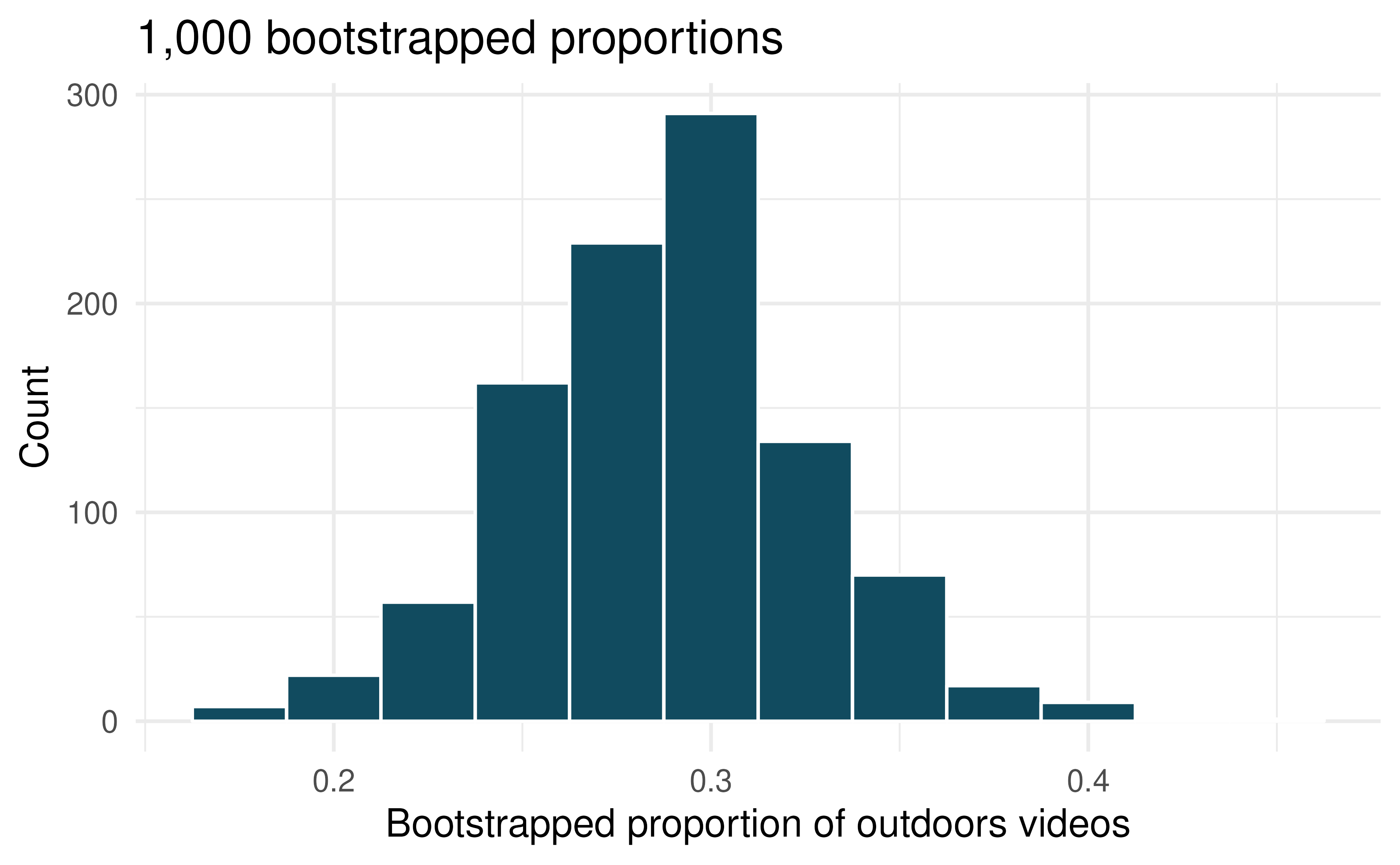 The histogram provides a bootstrap sampling distribution for the sample proportion (with 1000 bootstrap repetitions). Using the histogram, estimate a 90% confidence interval for the proportion of YouTube videos which take place outdoors.