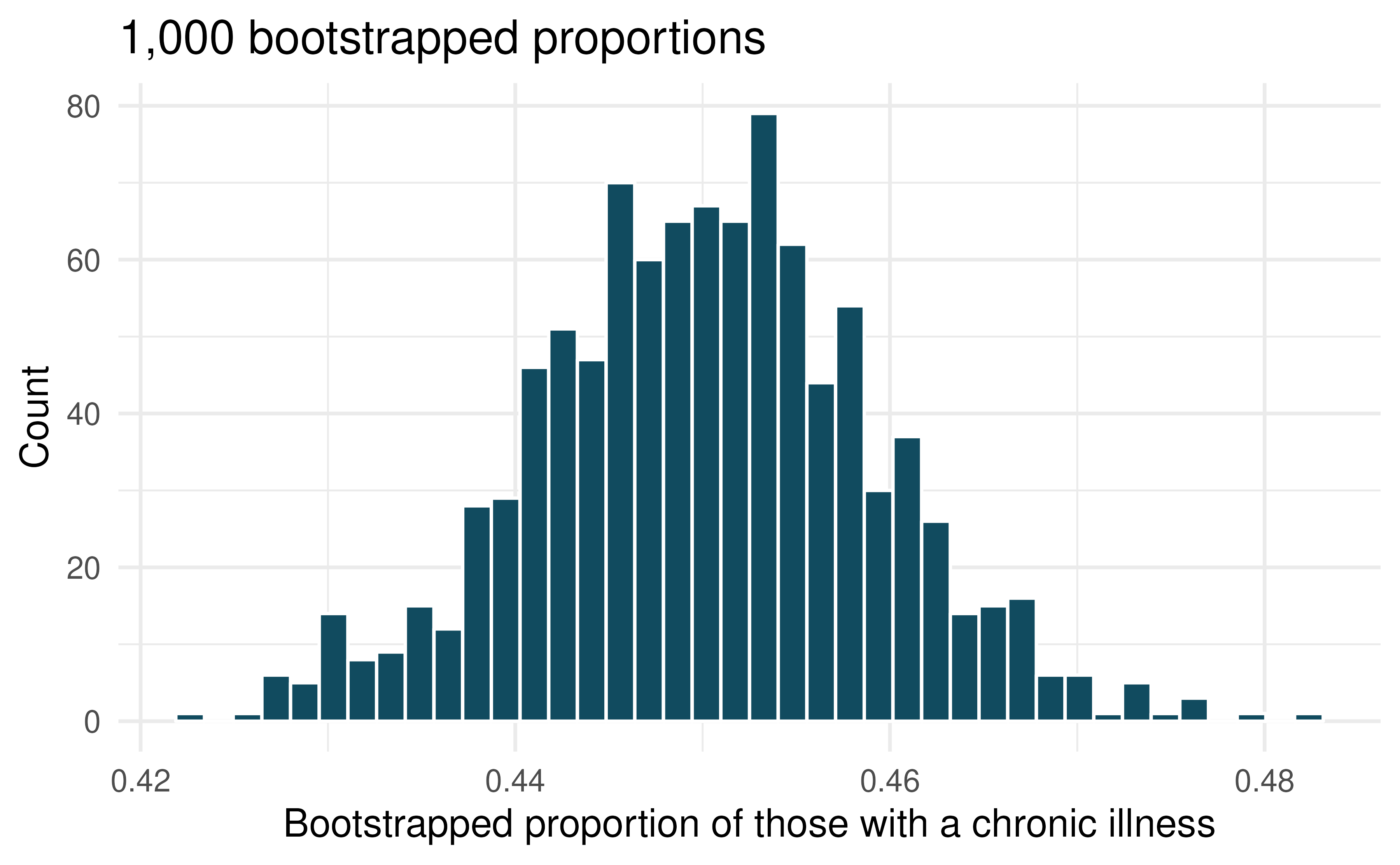 Chronic illness. In 2012 the Pew Research Foundation reported that “45% of US adults report that they live with one or more chronic conditions.” However, this value was based on a sample, so it may not be a perfect estimate for the population parameter of interest on its own. The study was based on a sample of 3014 adults. Below is a distribution of 1000 bootstrapped sample proportions from the Pew dataset. (Pew Research Center 2013a)