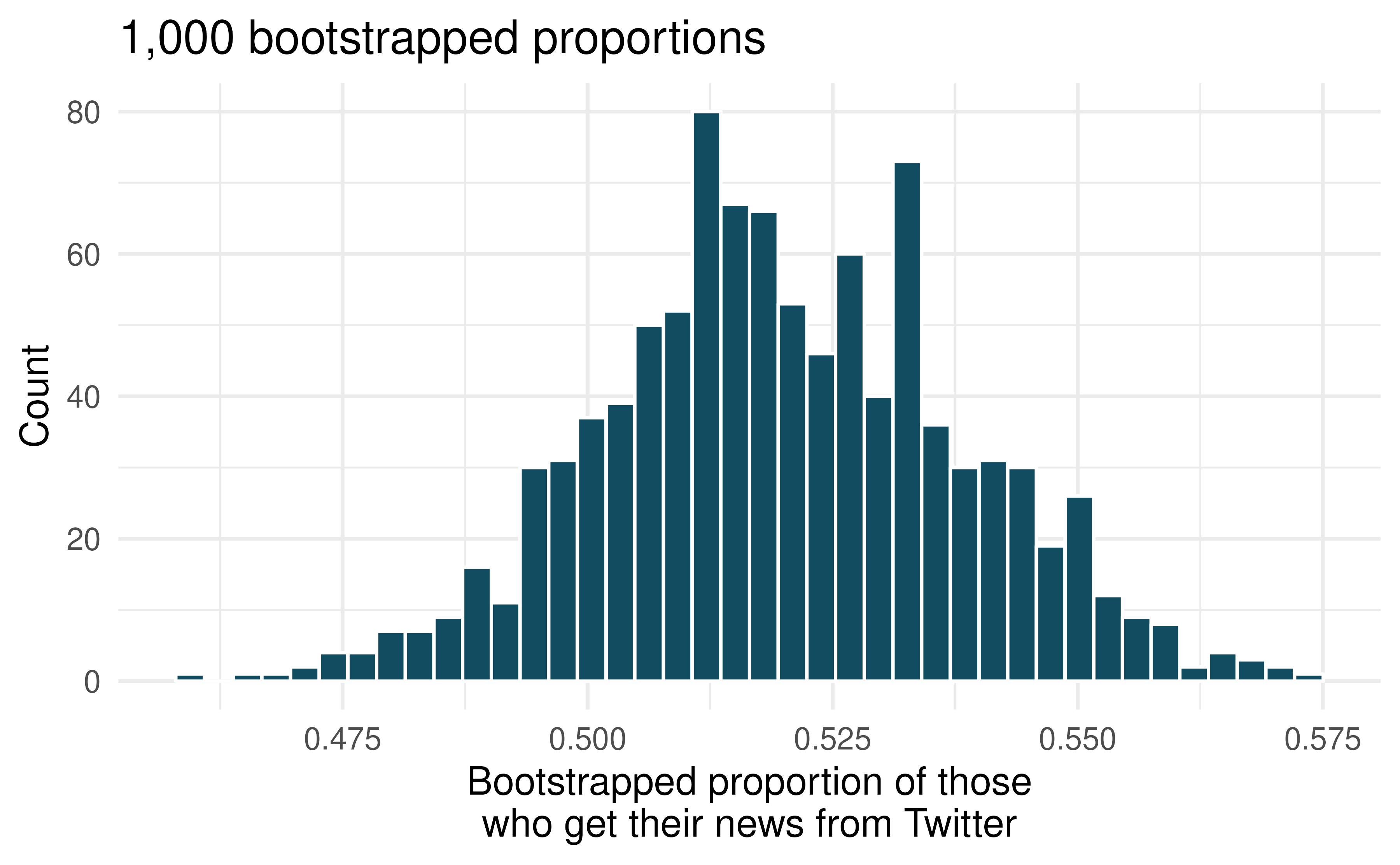 Twitter users and news. A poll conducted in 2013 found that 52% of all US adult Twitter users get at least some news on Twitter. However, this value was based on a sample, so it may not be a perfect estimate for the population parameter of interest on its own. The study was based on a sample of 736 adults. Below is a distribution of 1000 bootstrapped sample proportions from the Pew dataset. (Pew Research Center 2013b)