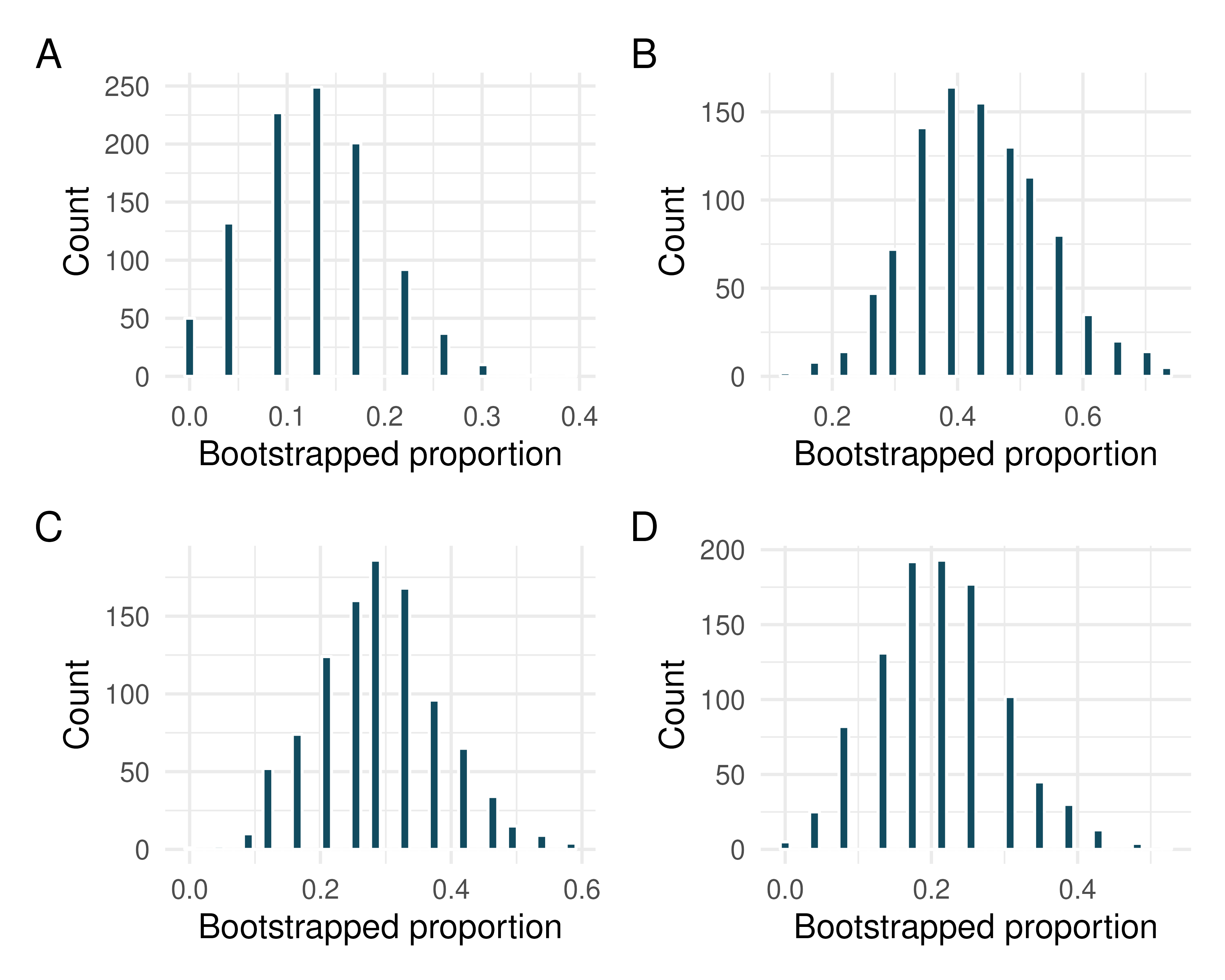 Bootstrap distributions of \(\hat{p}\), II. Each of the following four distributions was created using a different dataset. Each dataset was based on \(n=23\) observations.