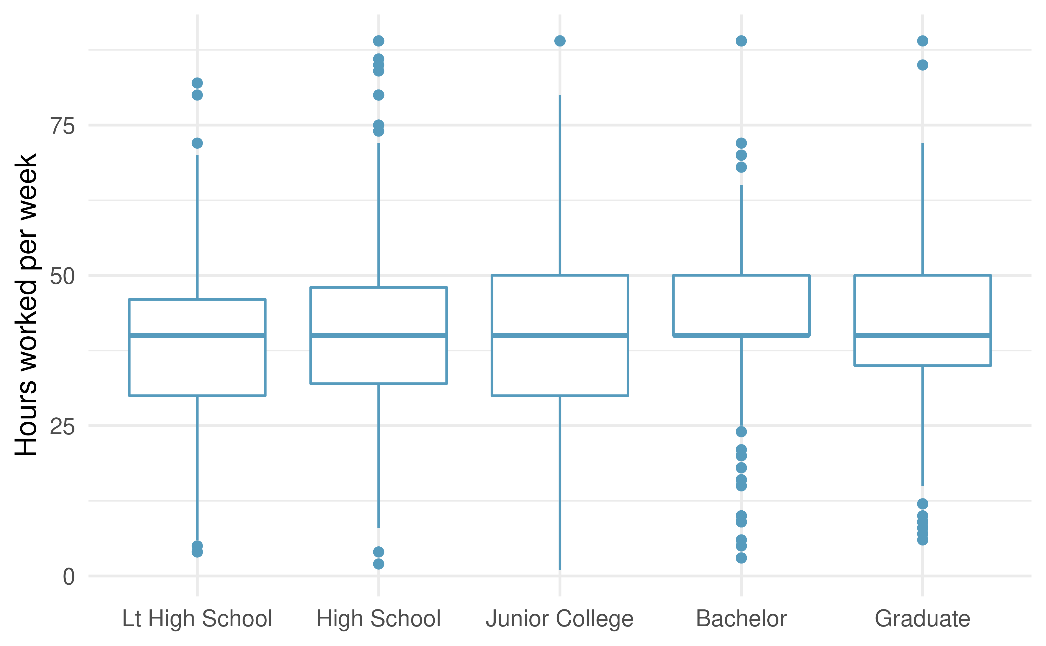 Work hours and education. The General Social Survey collects data on demographics, education, and work, among many other characteristics of US residents. (NORC 2010) Using ANOVA, we can consider educational attainment levels for all 1,172 respondents at once. Below are the distributions of hours worked by educational attainment and relevant summary statistics that will be helpful in carrying out this analysis.