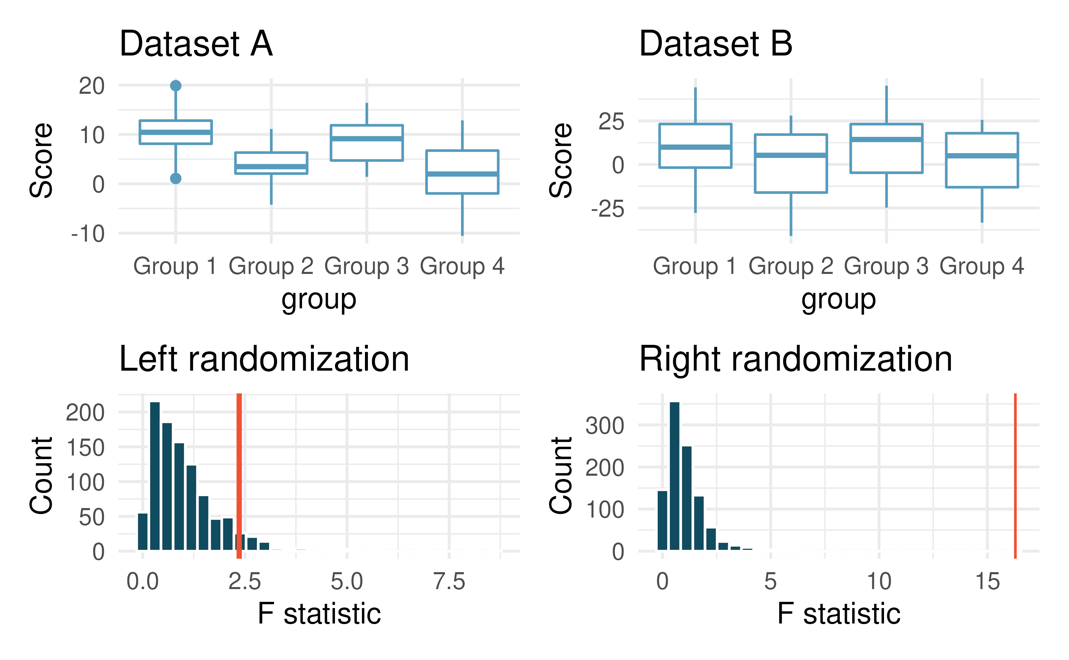 The randomizations (randomly assigning group to the score, calculating a randomization F statistic) were done 1000 times for each of Dataset A and B. The red line on each plot indicates the observed F statistic for the original (unrandomized) data.
