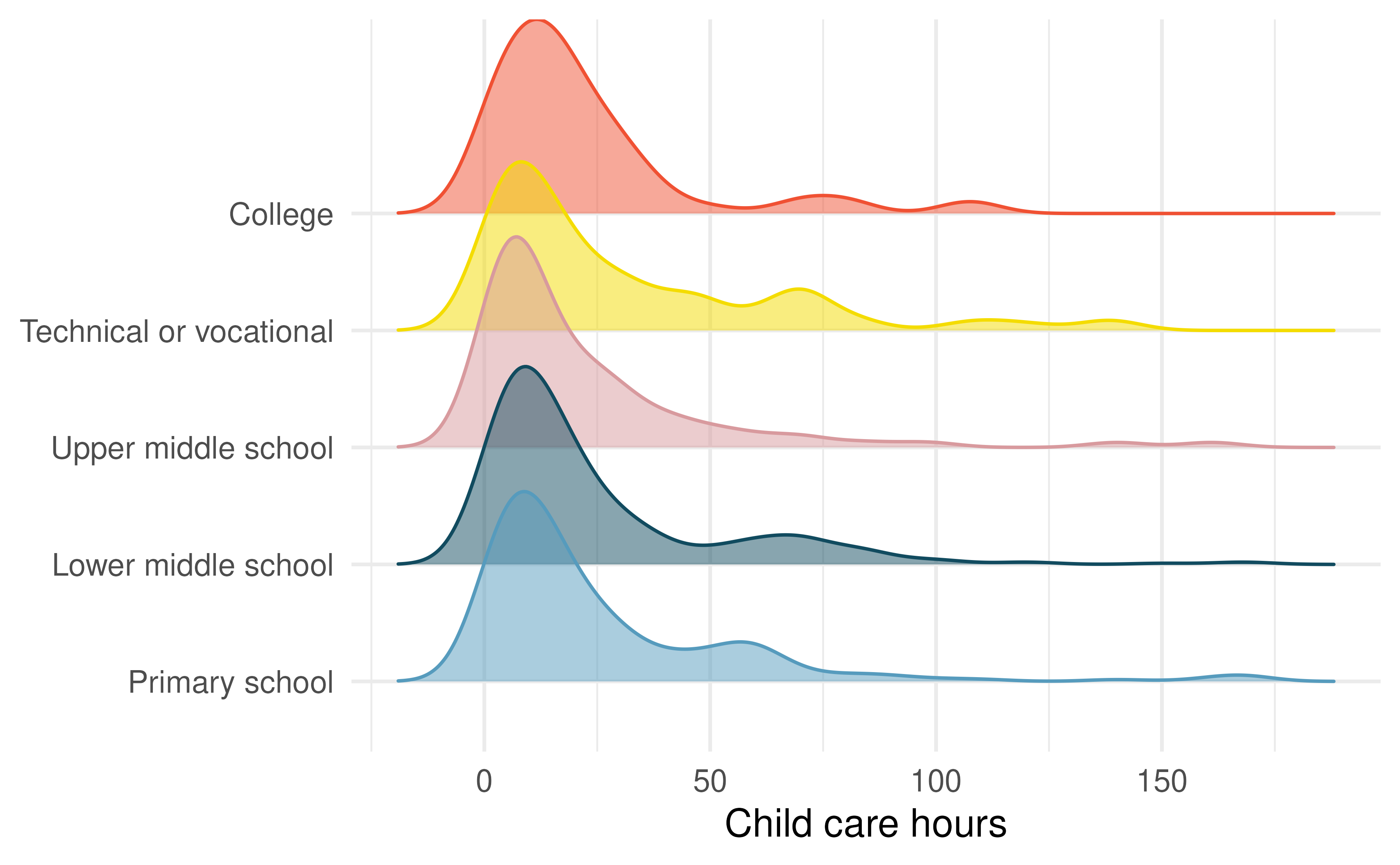 Write the hypotheses for testing for a difference between the average number of hours spent on child care across educational attainment levels.