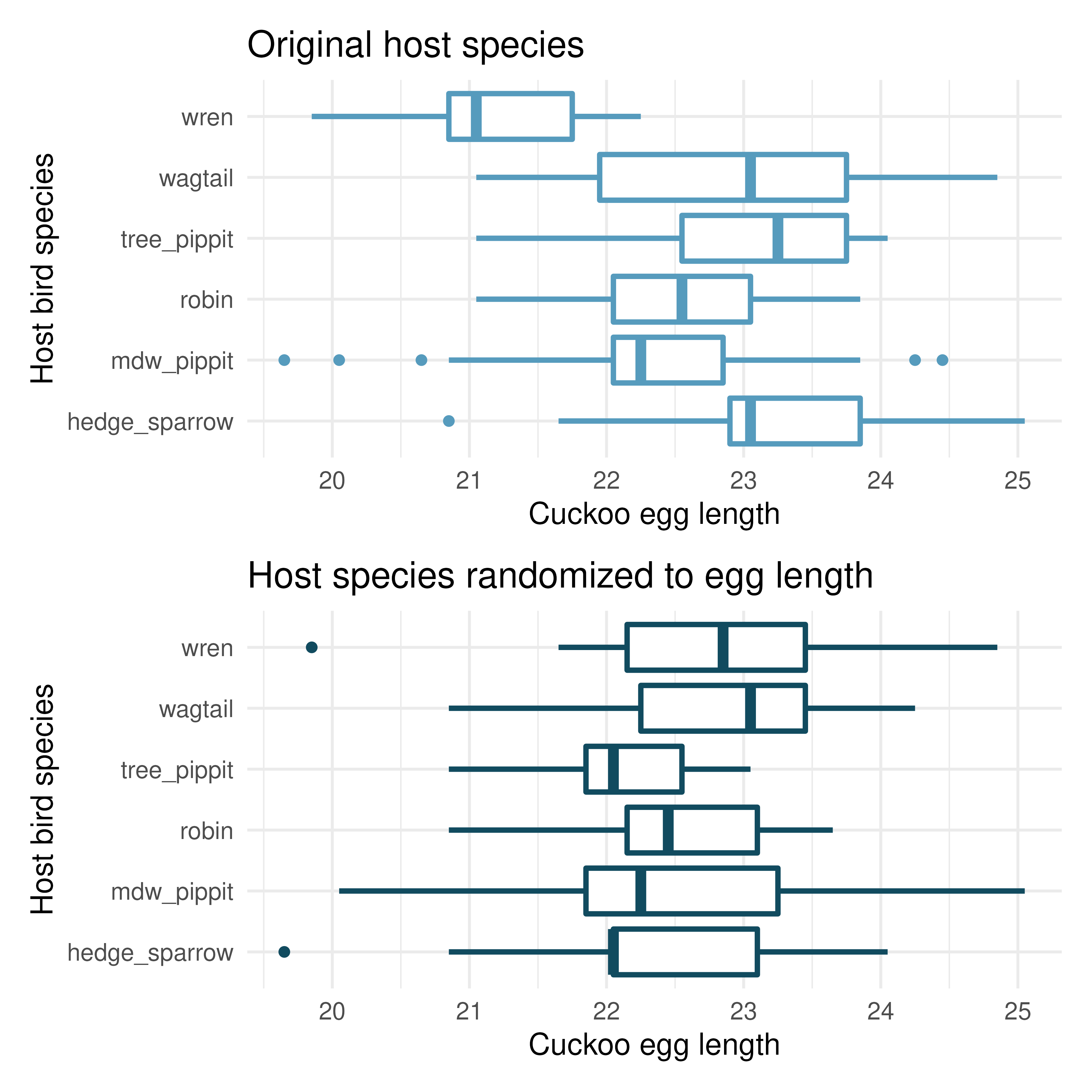 Figure 16.4 shows the process of randomizing the three different exams to the observed exam scores. If the null hypothesis is true, then exam scores should vary only as a function of the ability if the students taking the exams, not whether they were given exam A or exam B or exam C. By randomly reallocating which student got which exam, we are able to understand how the difference in average exam scores changes due only to natural variability. Figure 16.4 shows one iteration of the randomization process, leading to three different randomized sample means (computed assuming the null hypothesis is true).