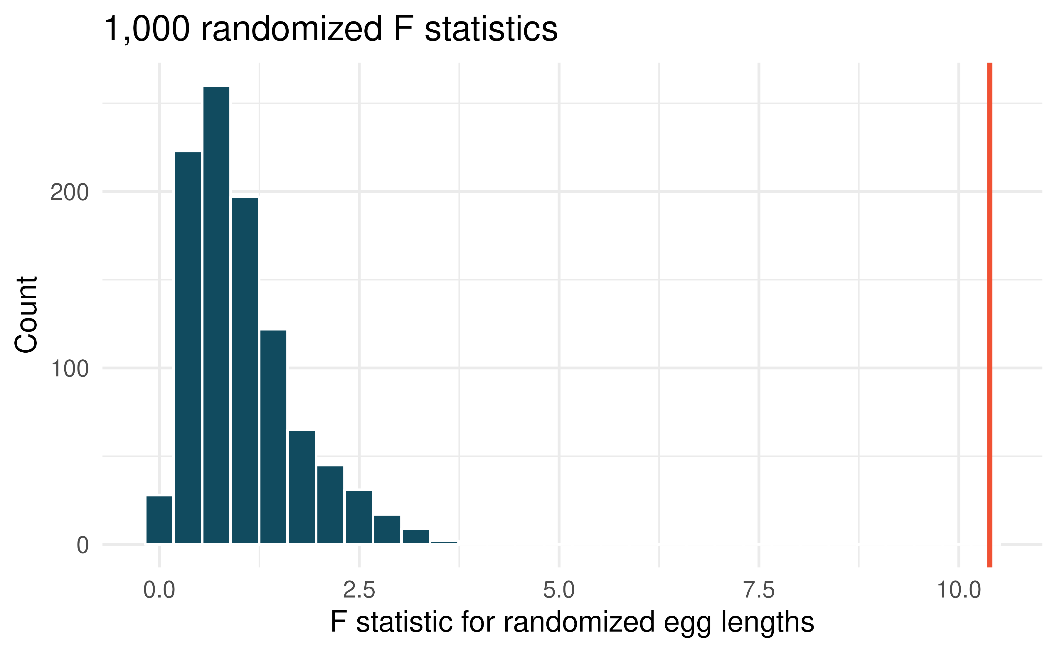 Building on Figure 16.4, Figure 16.5 shows the values of the simulated \(F\) statistics over 1,000 random simulations. We see that, just by chance, the F statistic can be as large as 7.