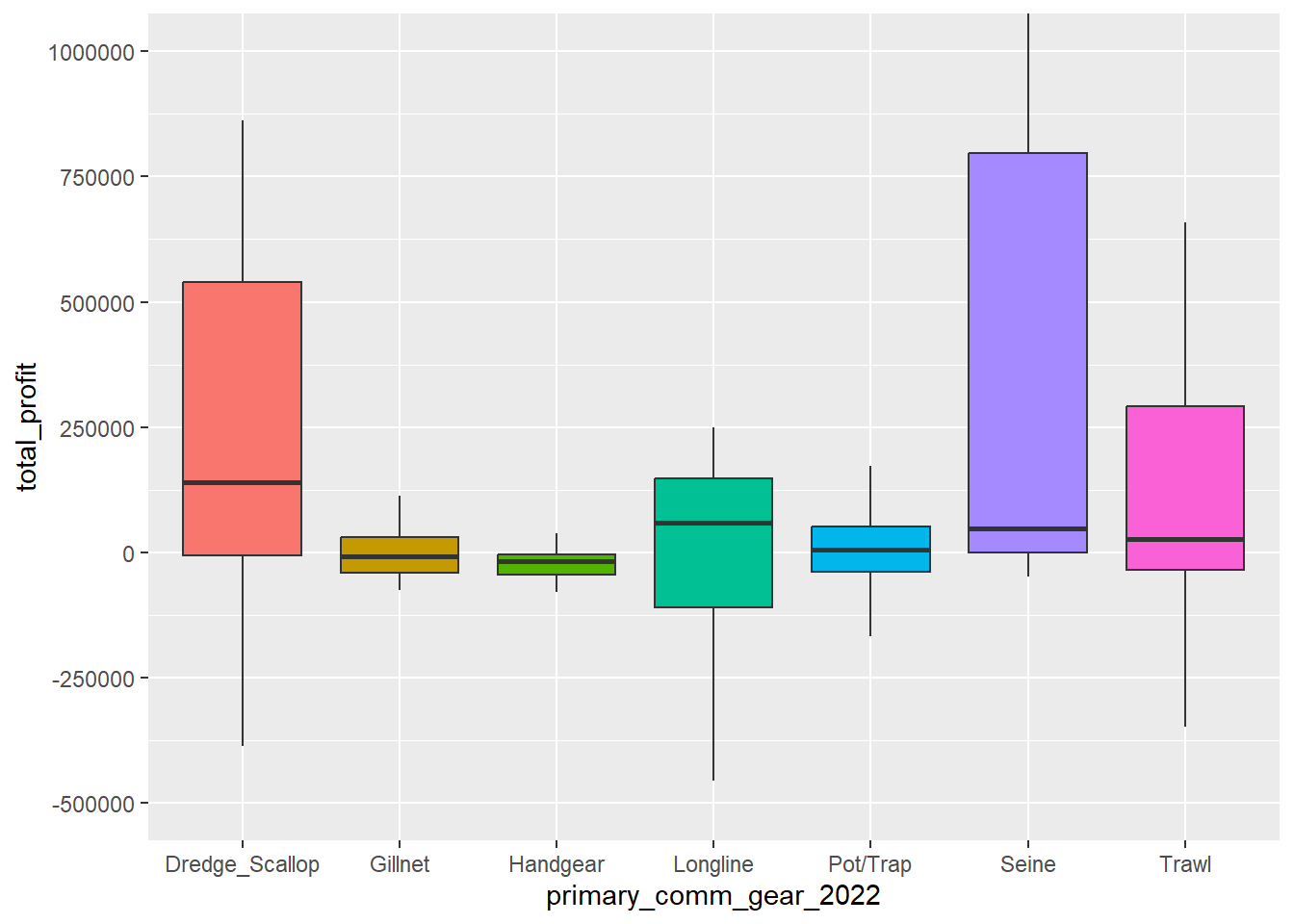 By primary gear, scallop dredge has considerably higher mean and median total profit than other gear groups. Trawl has the second highest mean and median values. Gillnet, handgear, and pot/trap show negative mean profit while the median value is slightly positive for pot/trap.. For scallop dredge and trawl gear, mean values greatly exceed median values. For pot/trap the opposite is true.