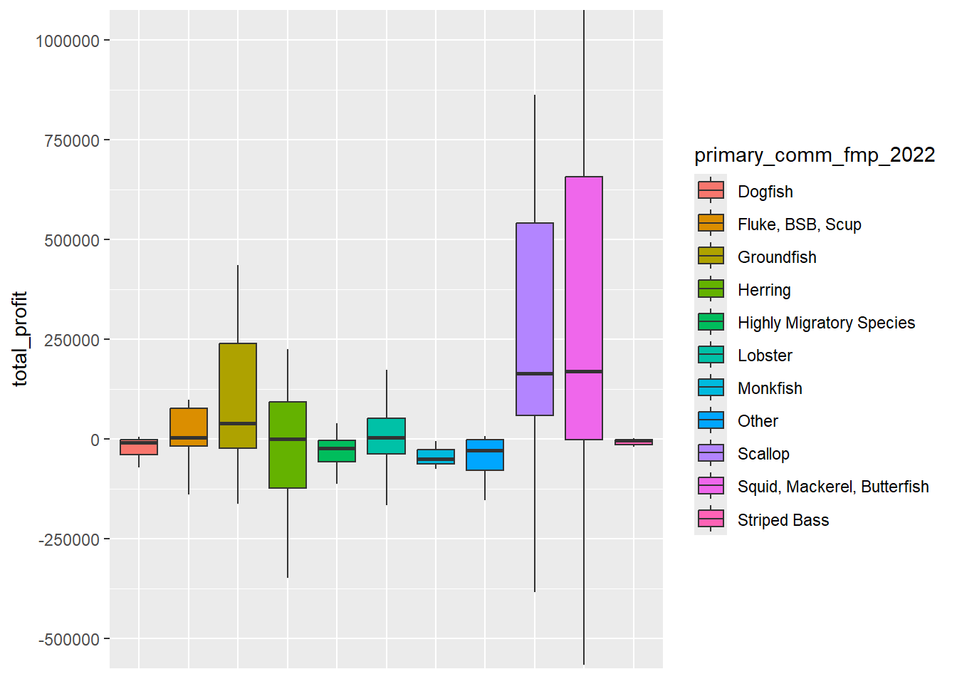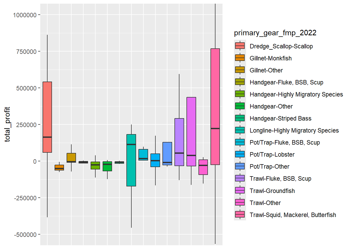 When primary gear and FMP are combined, trawl-squid, mackerel, butterfish, trawl-groundfish, and scallop dredge-scallop have the highest mean profits. Median values tell a different story, with trawl groundfish showing profits more similar to trawl vessels in the summer flounder, black sea bass, scup fishery. Within primary gear types, a considerable difference in operating profit is found across fisheries. For example, within the pot/trap gear group, summer flounder, black sea bass, scup vessels have higher profits compared to lobster. This is noteworthy as lobster vessels showed higher revenues than summer flounder, black sea bass, scup vessels. This example underscores the importance of cost data in evaluating the economic performance of fisheries.