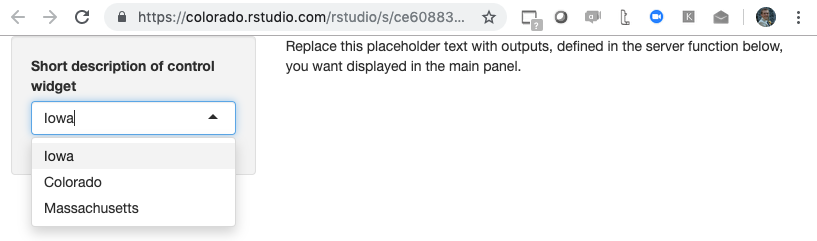 With applications using a sidebar layout style, it is common to add widget controls in the sidePanel function, since it is better to reserver the bigger mainPanel for displaying plots. Below is an example of how you would add a searchable dropdown box to your shiny application using the widget control function selectInput: