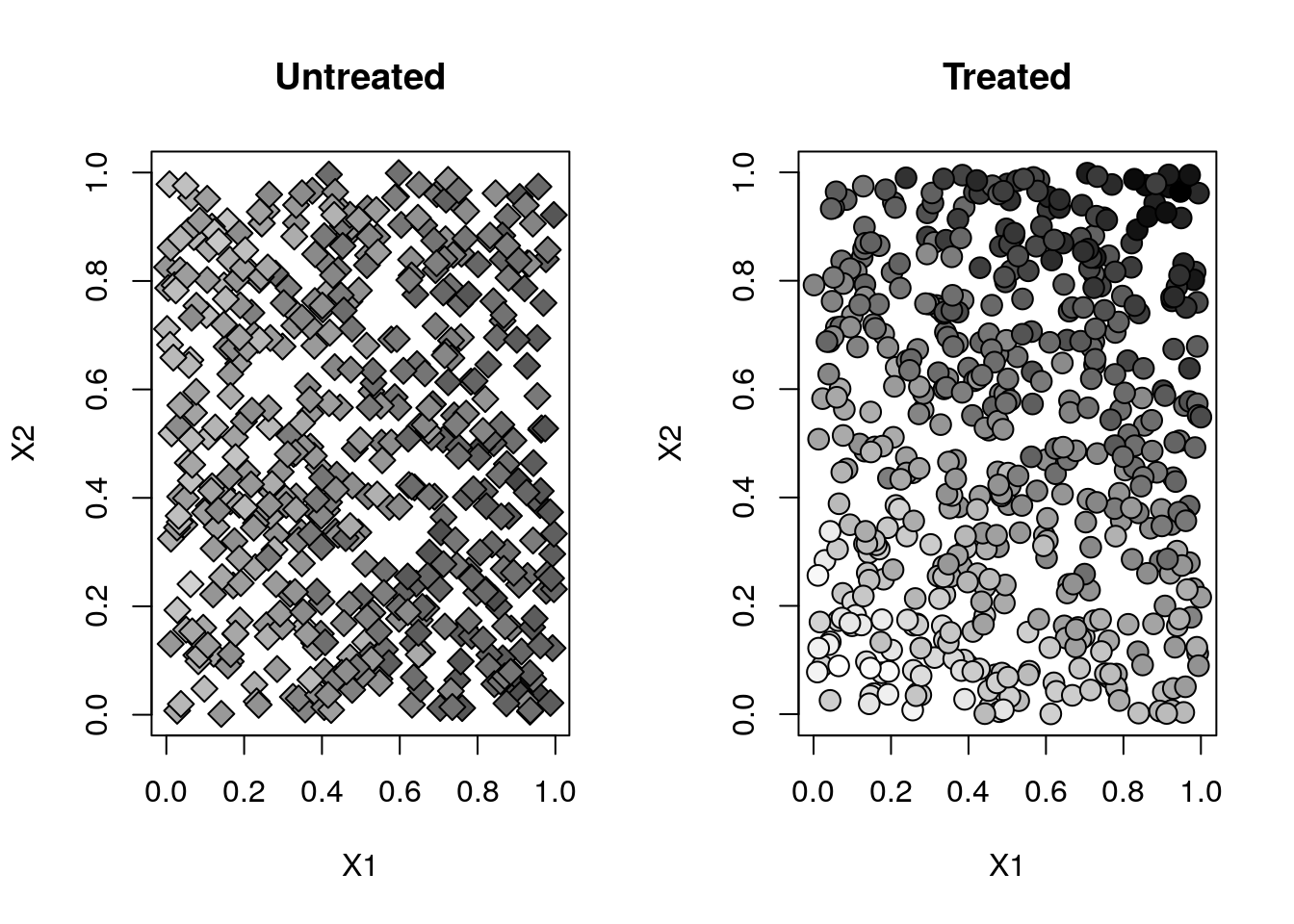 Here’s a graph of each treated and untreated population separately. Remark two things about this plot. First, the covariate distribution between the two plots is the same — which is what we should expect in a randomized setting. Second, observations with higher values of \(X_2\) react positively to treatment (their blobs are darker than the untreated counterparts, which observations with lower values of \(X_2\) react negatively (their blobs are lighter).