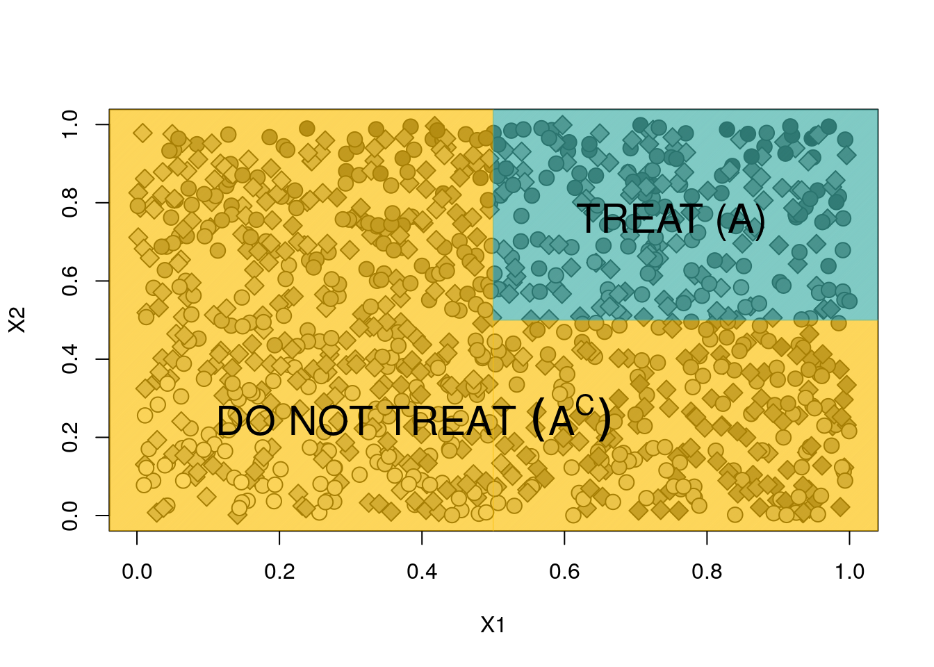 This policy divides the plane into a “treatment” region \(A\) and a complementary “no treatment” region \(A^c\), \[\begin{equation} A := \{ x : \pi(x) = 1 \} = \{x: x_{1} > .5, x_{2} > .5\}. \end{equation}\]