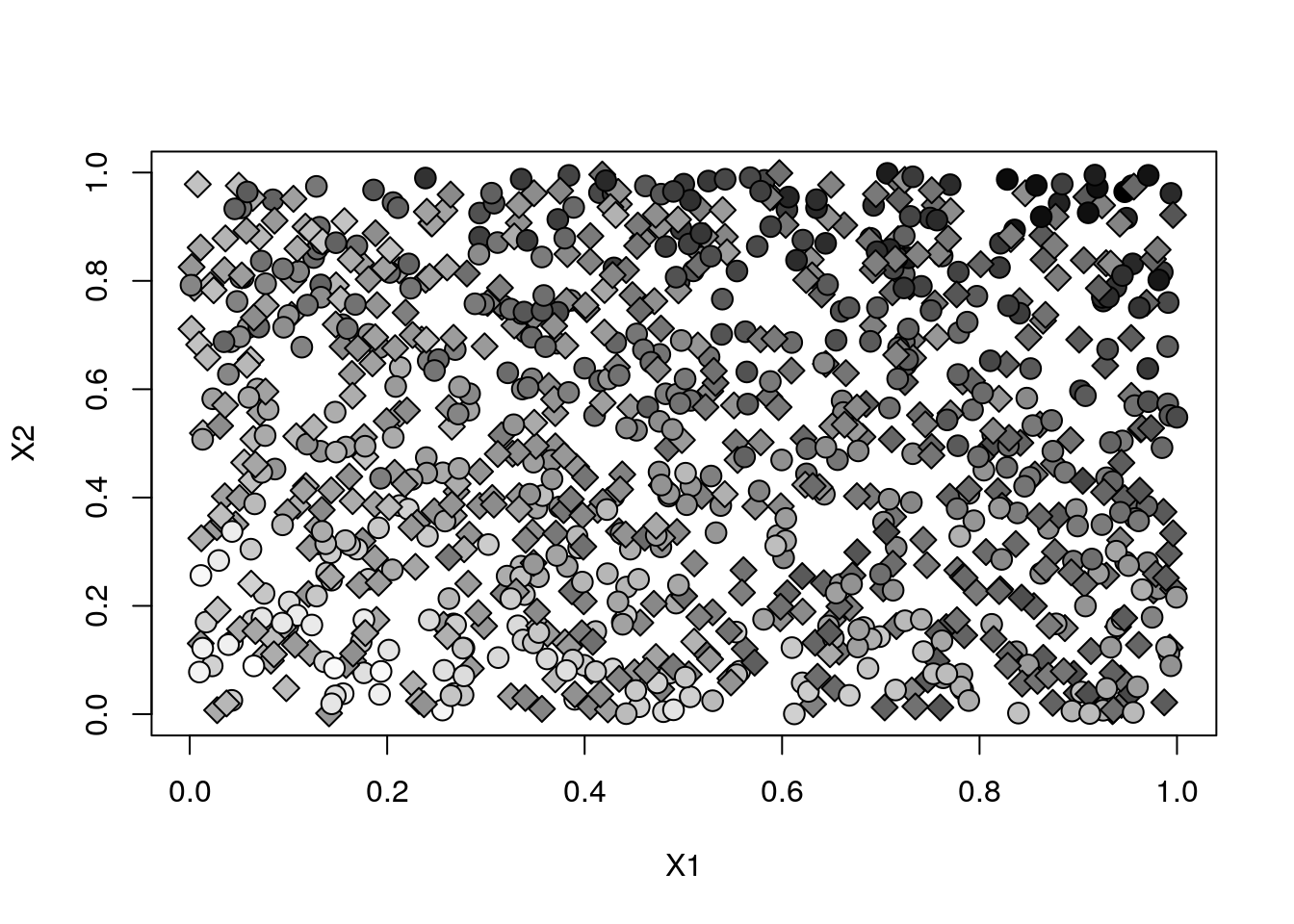 Y <- .5*(X[,1] - .5) + (X[,2] - .5)*W + .1 * rnorm(n) Here is a scatterplot of the data. Each data point is represented by a square if untreated or by a circle if treated in the eperiment. The shade of the point indicates the strength of the outcome, with more negative values being zero and more positive values being darker.
