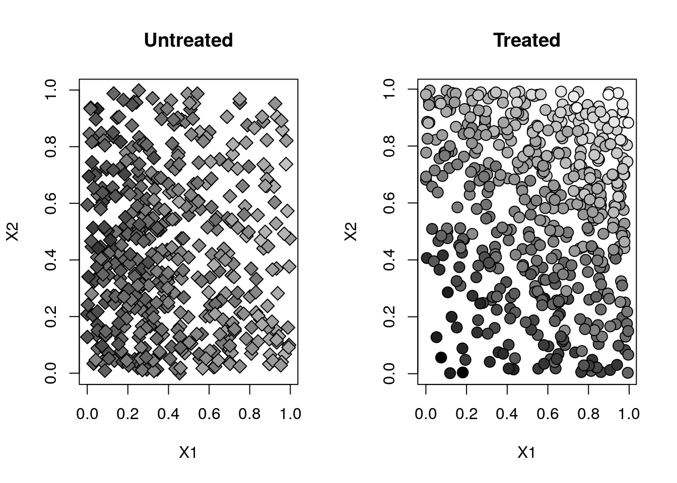 Here’s a graph of each treated and untreated population separately. Remark two things about this plot. First, the covariate distribution between the two plots is the same — which is what we should expect in a randomized setting. Second, observations with higher values of \(X_2\) react positively to treatment (their blobs are darker than the untreated counterparts, which observations with lower values of \(X_2\) react negatively (their blobs are lighter).