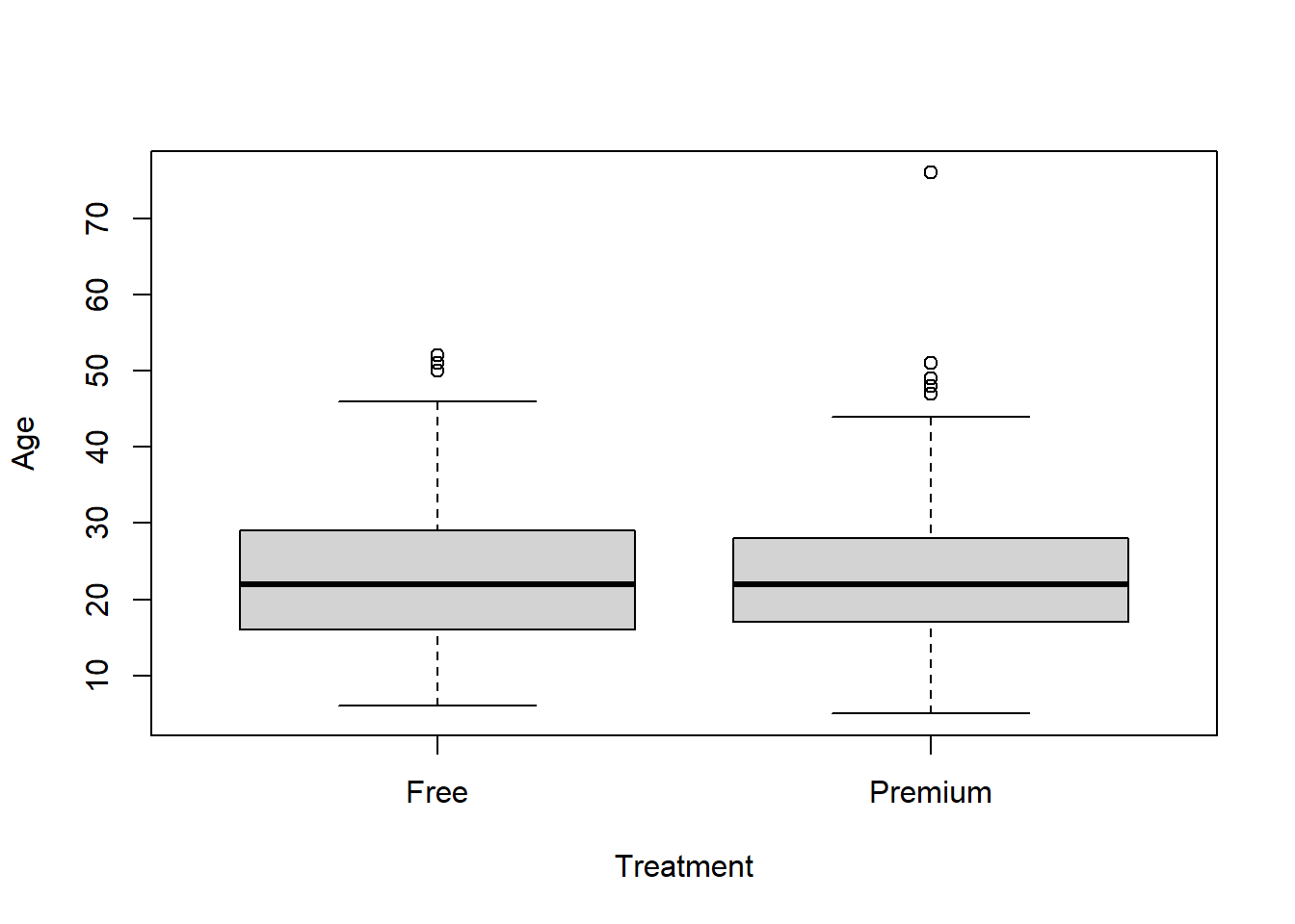 Unlike the observational data from the previous section, there is now no significant difference in age between the treatment and control groups: