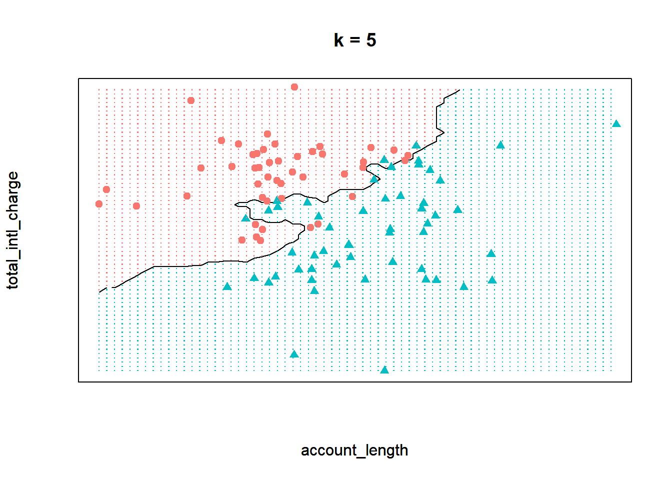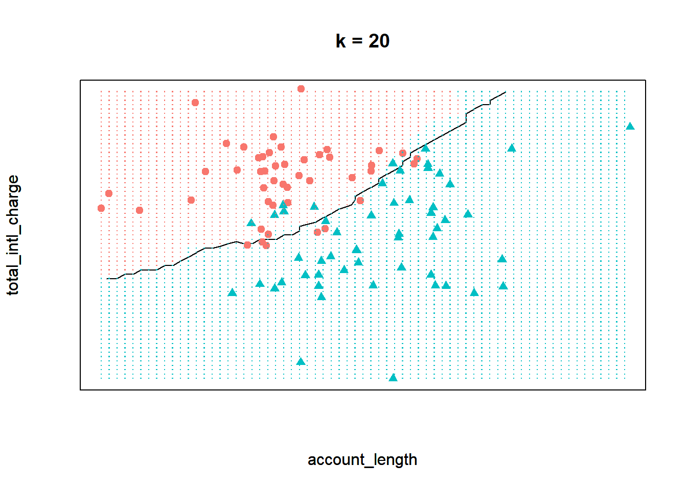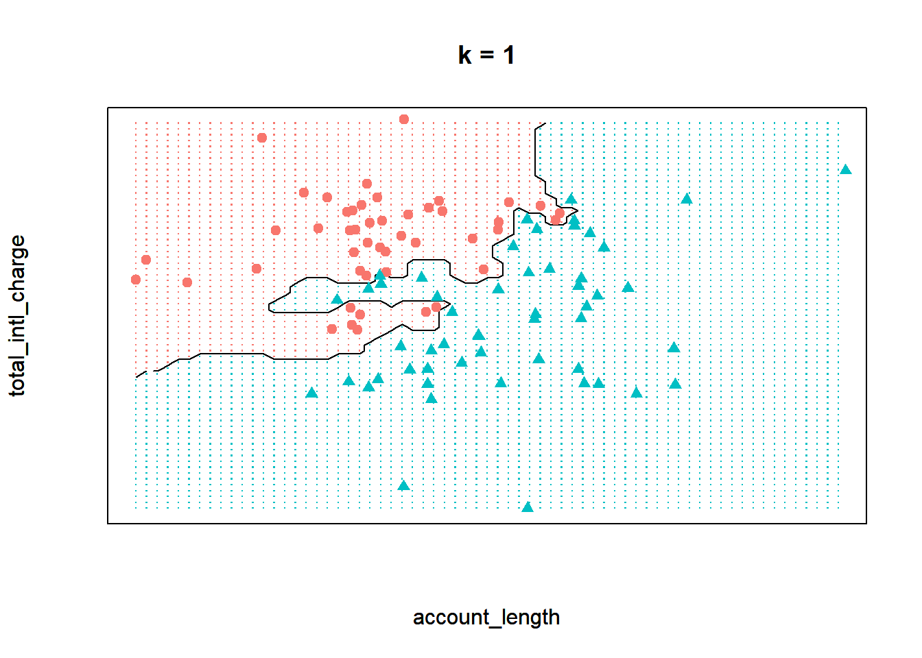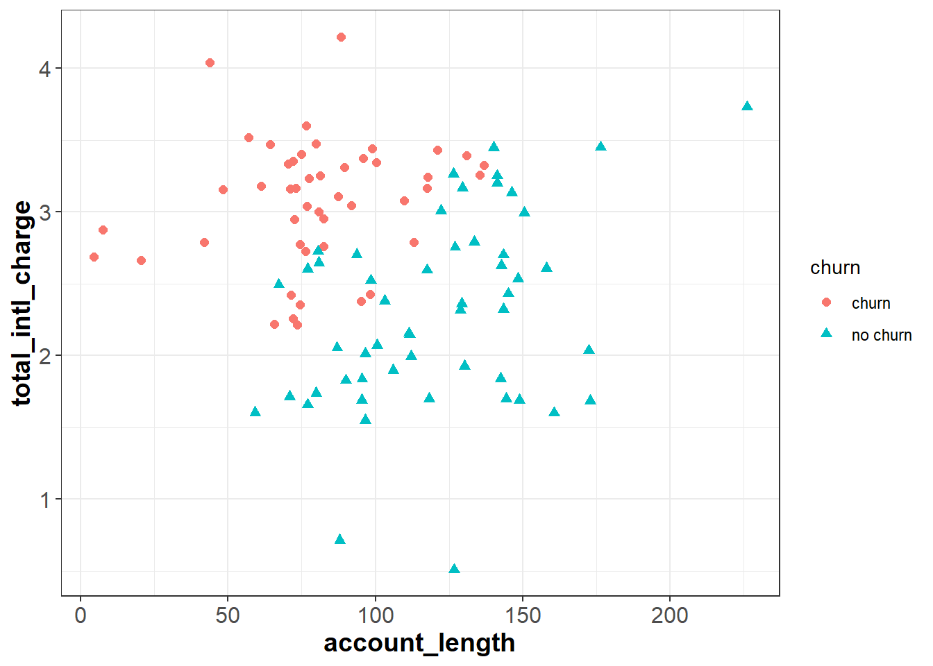 To demonstrate knn, let’s start with a simplified data set that only has 100 observations and two independent features, total_intl_charge and account_length. Our feature space, or the geometric space that our data occupy, looks like the following:
