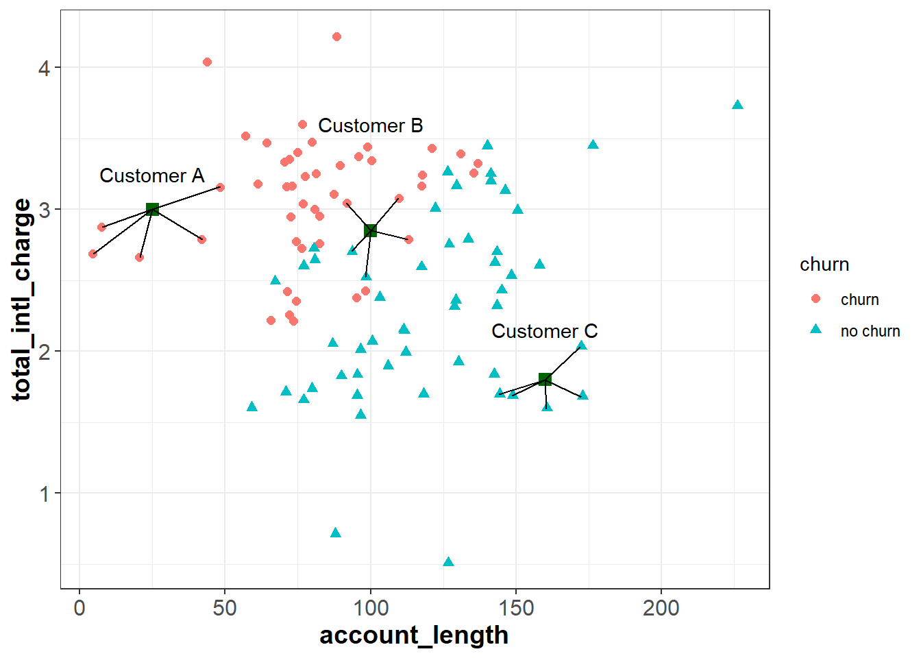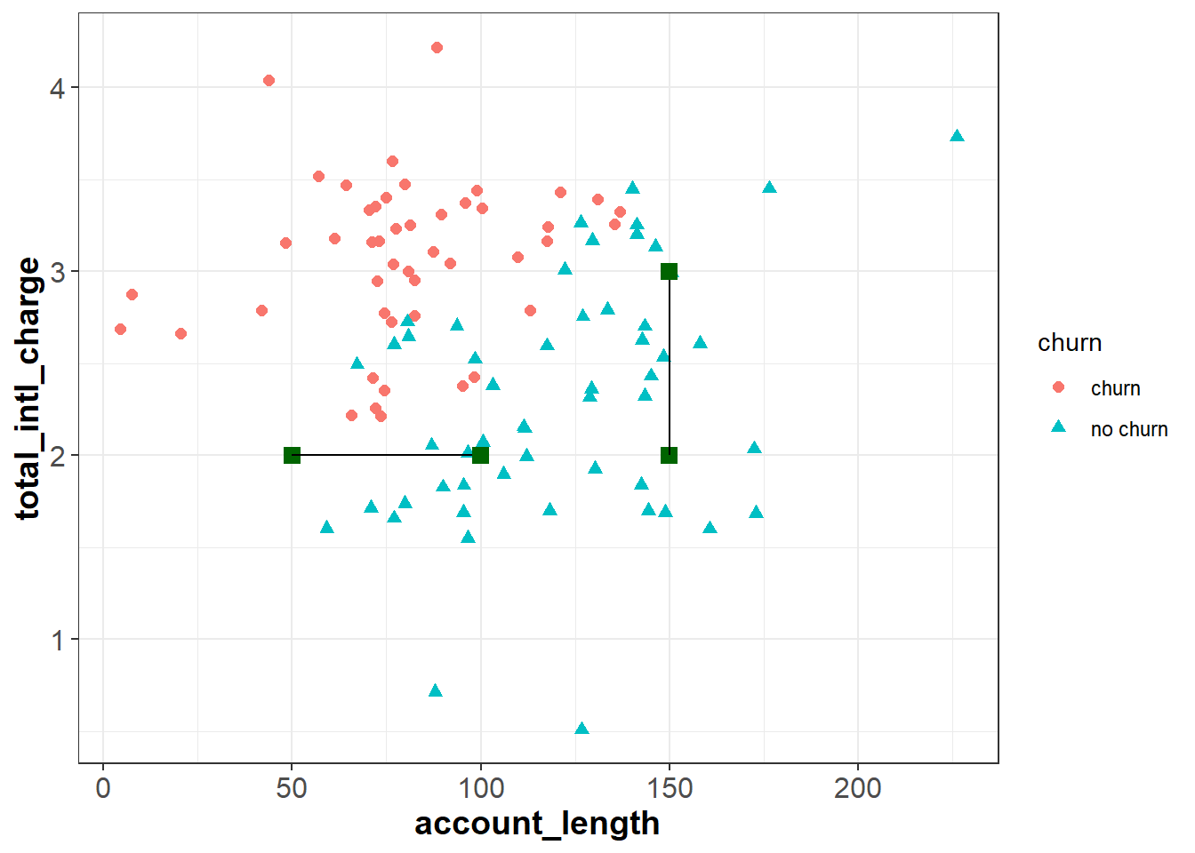 Suppose we have three new customers and would like to predict whether or not they will churn in the upcoming quarter. These customers are plotted as green squares in the figure below. If we use a \(k\) of five, we can find the five customers in churn that are most similar to our new customers (based on their account_length and total_intl_charge):