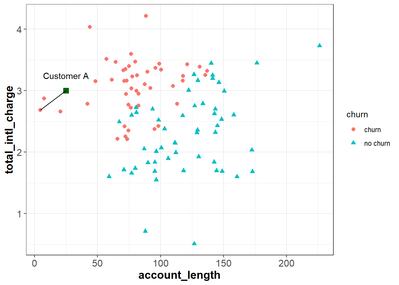 For Customer B, three of the nearest neighbors churned and two did not. Therefore, for this observation the model would predict a 60% chance of churning (3 churns / 5 neighbors = 0.60). Ultimately we need to make a binary decision about whether to intervene on this customer’s account or not. To do this, we need to convert the predicted probability of 60% into a binary prediction of “churn” or “no churn”. Because the predicted chance of churning is greater than 50%, the model is predicting that it is more likely than not that the customer will churn. Therefore, one may choose to treat this as a prediction of “churn”. In this case, we have used a cutoff of 50% to convert the model’s prediction into a binary outcome; if the predicted probability is less than 50% we interpret the prediction as “no churn”, and if it is greater than 50% we interpret it as “churn”.