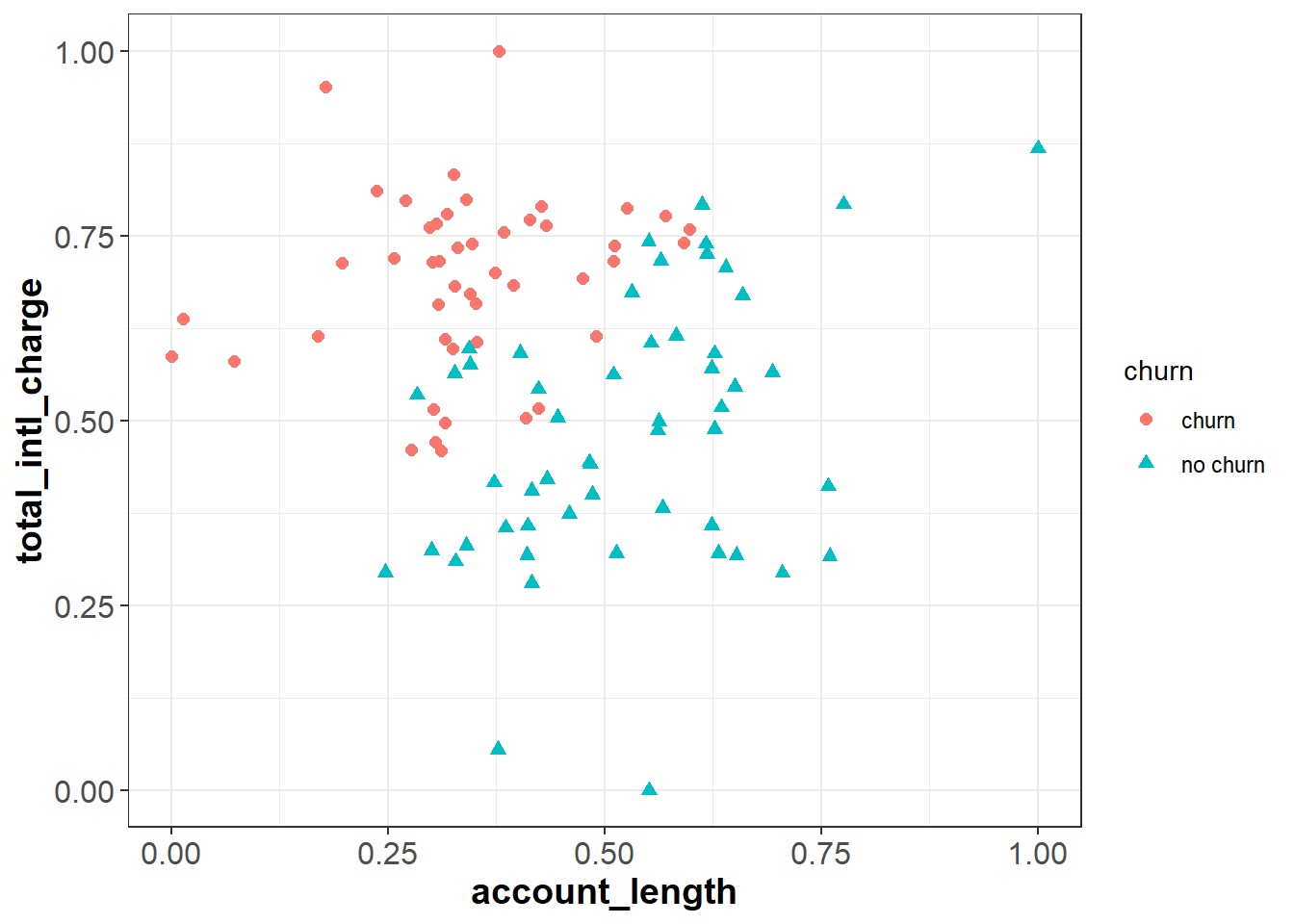 If we apply this process to our data set, our feature space will look the same, but account_length and total_intl_charge will both be in the range [0, 1]:
