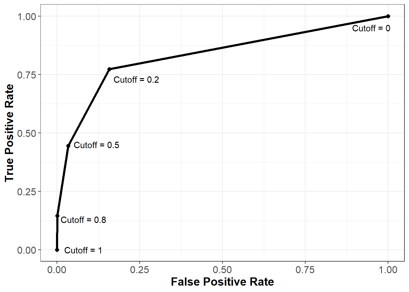 Recall our three confusion matrices, which show the model’s performance at different cutoffs (0.2, 0.5, and 0.8). For 0.2, the false positive rate (or the proportion of non-churners that are incorrectly flagged as churners) is 117 / (623 + 117) = 15.81%. The true positive rate (or the proportion of churners that are correctly flagged as churners) is 85 / (25 + 85) = 77.27%. For 0.5 the false positive and true positive rates are (3.38%, 44.55%) respectively, and for 0.8 these values are (0.14%, 14.55%).