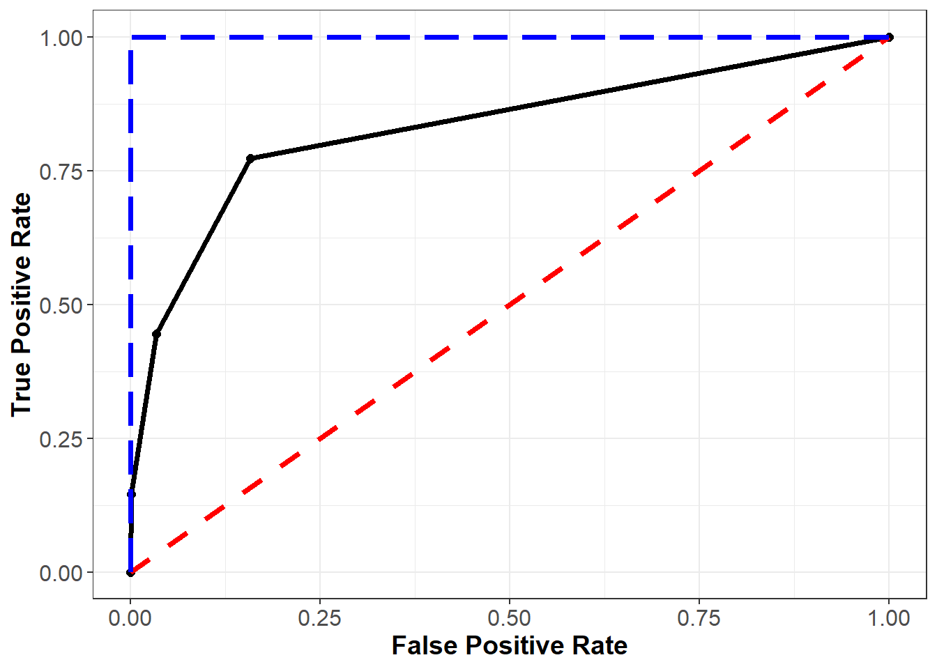 We can summarize this plot numerically through a measure known as area under the ROC curve (AUC), which (as the name implies) measures the area underneath our plotted ROC curve. If our curve fell on the red dotted line (representing the worst possible model), the area under the curve would be 0.5. Conversely, if our curve fell on the blue dotted line (representing the best possible model), the area under the curve would be 1. Therefore, the closer our AUC is to 1, the better our model, and the closer it is to 0.5, the worse our model. Note that because it is based on the ROC curve, this metric is independent of any particular cutoff value, unlike accuracy and confusion matrices.