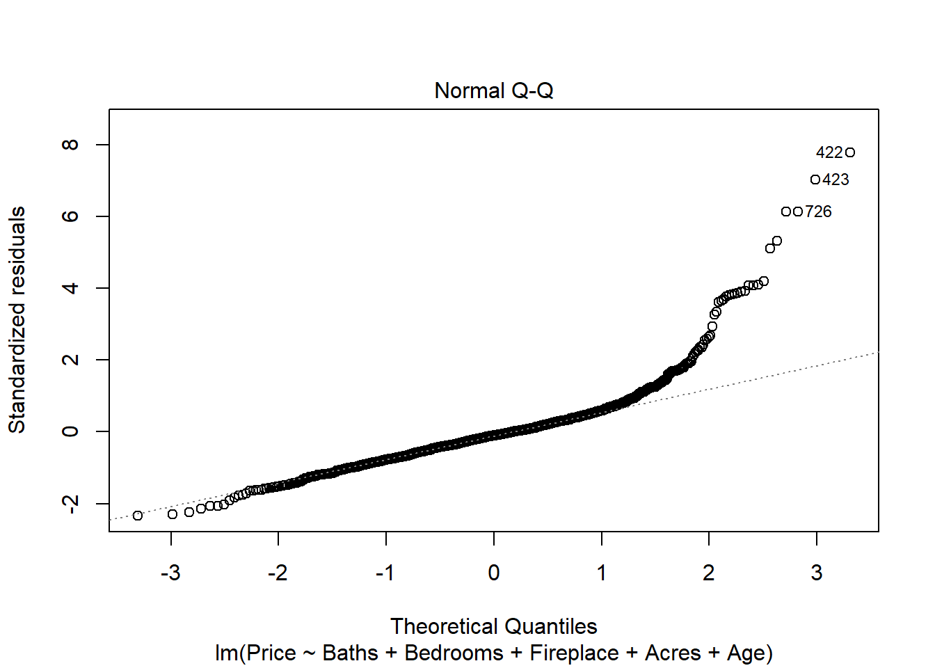 ## lm(formula = Price ~ Baths + Bedrooms + Fireplace + Acres + Age,