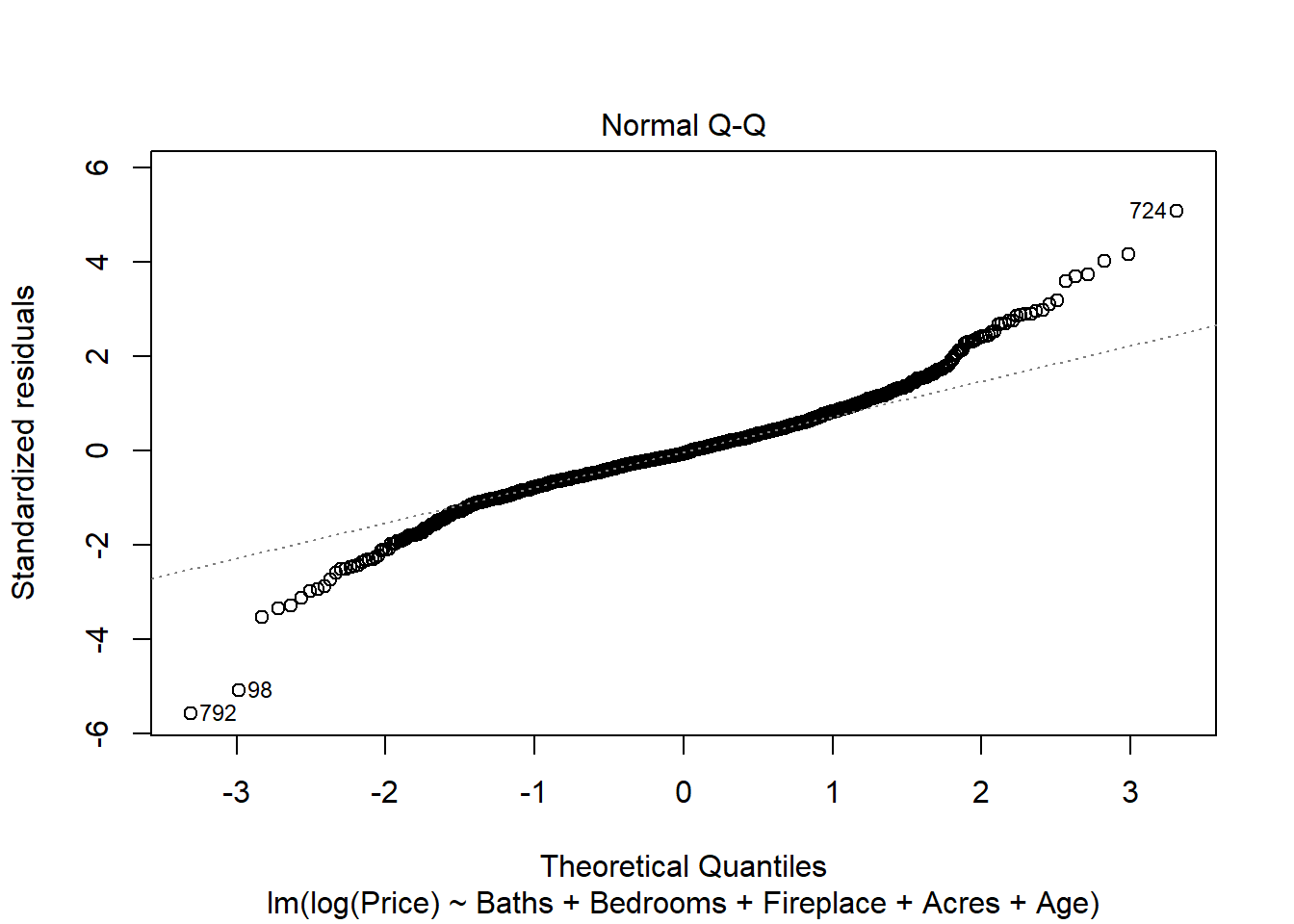 This qq-plot is problematic, as the right-hand side shows unusual tail behavior. This is likely because Price is positively-skewed; there are a handful of “outlier” houses that are very expensive. To address this, we could try fitting a new regression where we model the log of Price as our independent variable:
