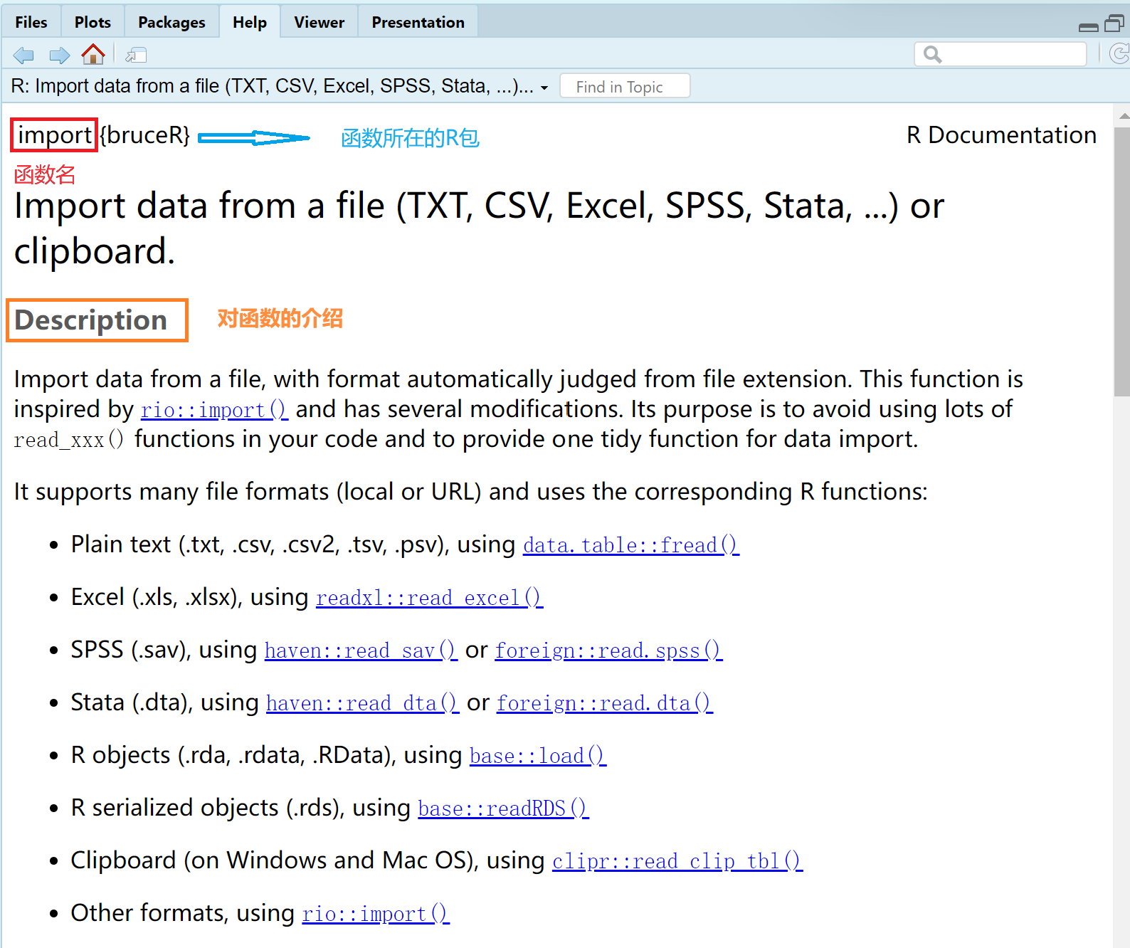 在导入数据的时候,我们使用了import()函数,在设置路径时,使用了here(),getwd(),setwd()等函数。在R中,函数是一种用于执行特定任务或计算的代码块。函数接受输入参数,执行特定的操作,并返回结果。如果我们不知道一个函数是什么,有什么用处。在R中,我们可以在Console中使用“?函数名”来打开帮助文档,以import()函数为例: