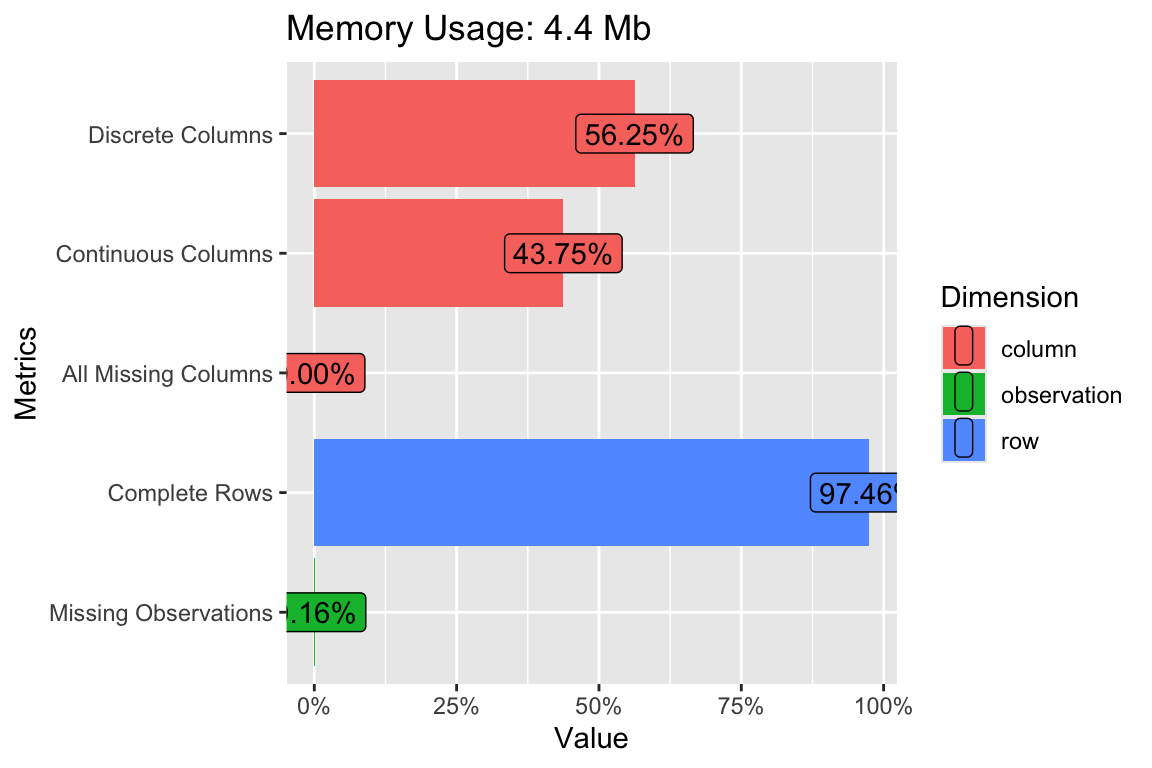 据探索包的一个独特特点,它可以帮助我们快速可视化数据。关于缺失值,我们可以使用plot_missing命令将具有缺失值的列可视化。大多数列都没有缺失值,只有一个响应列有2.5%的缺失值。