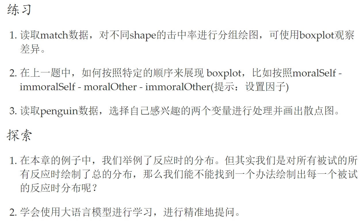 本节课重点强调了数据探索的重要性,尤其是通过可视化方式进行探索。我们已经开始使用ggplot2,虽然我只是展示了ggplot2的一些功能,并没有深入讲解每个元素的操控细节。这是因为我们的数据分析课程有一个渐进的流程:从数据导入、清洗,到初步了解数据,接下来自然是进行统计分析。在接下来的几节课中,我们将学习如何使用R进行统计分析。 这就要求大家通过练习来提高自己操作数据和探索数据的能力,将前面学到的内容整合起来。例如,通过选择数据框中的数据来进行绘图,以及对数据类型进行转换,改变图形中元素的呈现顺序。我建议大家针对不同图形的击中率进行分组绘图,并使用箱线图来展示。