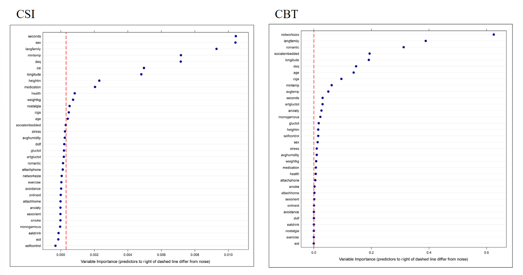 左边的图形实际上是用众多问卷数据来预测核心身体温度,即所谓的core body temperature。右边则是用身体温度来预测其他变量。我们主要关注的是左边的数据,如果大家能够看到的话,在这个地方有一个CSI,这表明社交关系网络的复杂度是一个重要的预测身体核心温度的变量。当然,还有一些其他非心理因素的变量,比如所在站点的最低温度,即与赤道的距离等,对核心温度的预测作用更强。