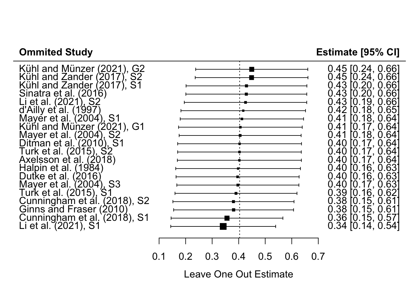 在执行去一法敏感性分析并绘制新的森林图后,我们可以观察到效应量估计值的变化,从而评估每个研究对整体效应量估计的贡献。例如,如果去掉第一个研究后,效应量估计值显著增加,这可能表明该研究的结果与整体趋势不同,或者其效应量估计可能存在偏差。 通过敏感性分析,我们可以识别出那些对整体效应量估计有显著影响的“极端”研究。例如,如果某个研究报告了一个非常大的效应量,而通过去一法分析发现,去掉这个研究后,效应量的估计值并没有发生显著变化,这表明该研究对整体效应量估计的影响并不大,从而增强了研究的稳健性。 在敏感性分析的报告或讨论中,我们会指出效应量估计值的变化范围,并解释这些变化对研究稳健性的影响。例如,如果效应量估计值的变化范围从0.34到0.45,虽然存在一定的波动,但整体变化不大,这表明研究结果是稳健的,不会因为单个研究结果的极端值而产生重大偏差。 通过这种方式,敏感性分析帮助我们理解每个研究对整体结果的影响,并评估研究的稳健性。