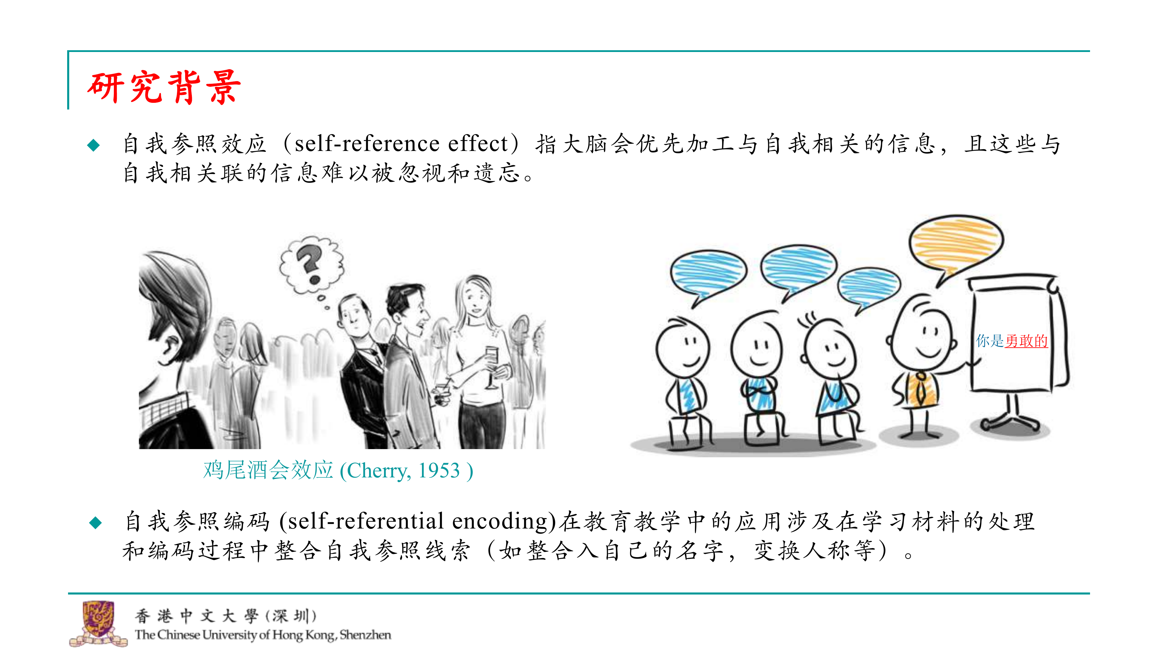 我们这篇文章的研究背景集中在自我信息加工领域,这是一个大家可能都比较熟悉的领域。在自我信息加工中,有一个广为人知的效应,称为自我参照效应或自我优势效应。这个效应表明,我们的大脑倾向于优先加工与自我相关的信息,这些信息也更难以被忽视和遗忘。比如,在嘈杂的环境中,如果有人叫你的名字,你往往能够过滤掉其他声音而捕捉到自己的名字,这就是自我参照效应的一个例子。