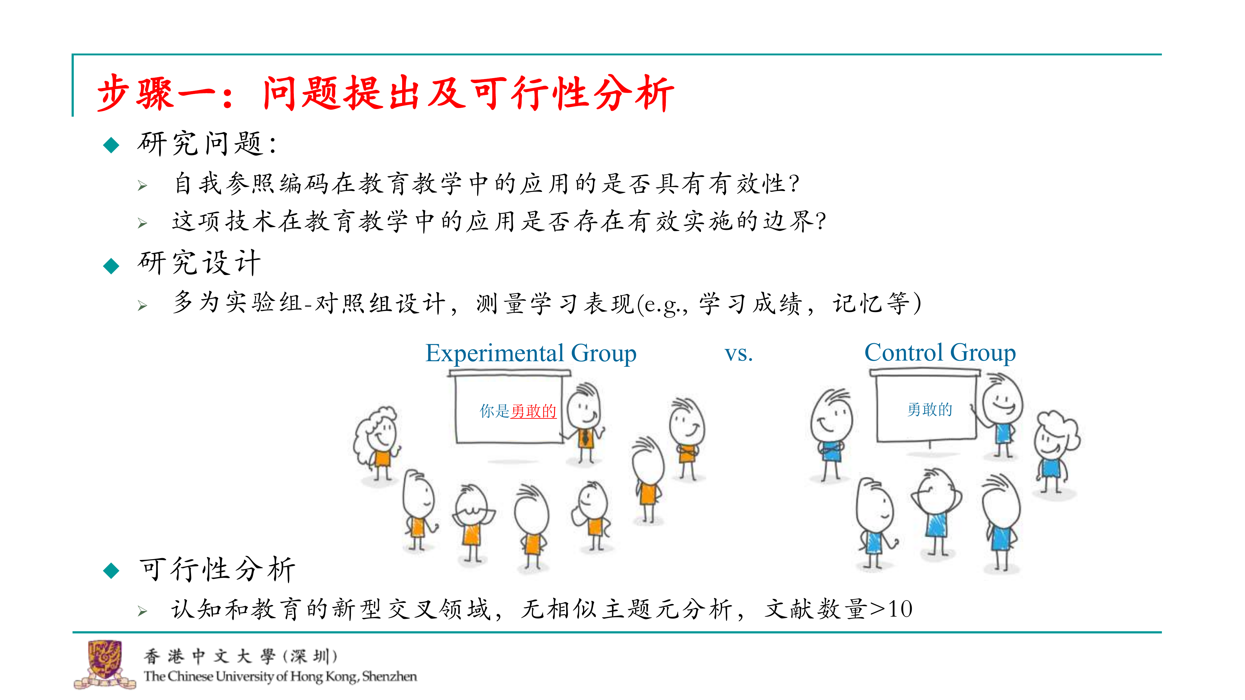 我们的研究问题非常直接。首先,我们关注的是大量使用自我参照编码的文章,这些文章检验了这种效应在教育教学中是否有效。其次,如果自我参照编码在教育教学中可能有效或无效,我们想探讨它是否受到某些边界条件的影响。例如,教育教学的实施者或所使用的材料类型可能会产生边界效应。 接下来,我们研究了这些研究的大致设计。通过Google Scholar的搜索,我们发现这些研究通常采用实验组和对照组的设计。实验组的学生会学习包含自我参照编码的学习材料,例如“你是勇敢的”或“你是自信的、阳光的”。而对照组可能直接让学生记忆这些词汇,或使用其他不含自我参照编码的学习策略。 我们还研究了是否有类似的元分析发表。由于这个领域可能是认知科学和教育学的交叉领域,我们并没有找到非常相似主题的元分析。虽然教育学中已经有一些相关的研究,但它们被归入了另一个框架,并不是在认知和教育的框架下。因此,与我们进行的研究可能并不会产生冲突。我们发现相关文献的数量超过了十篇,因此我们认为这是一个可行的小项目。最终,我们确定了可以进行这样的研究。