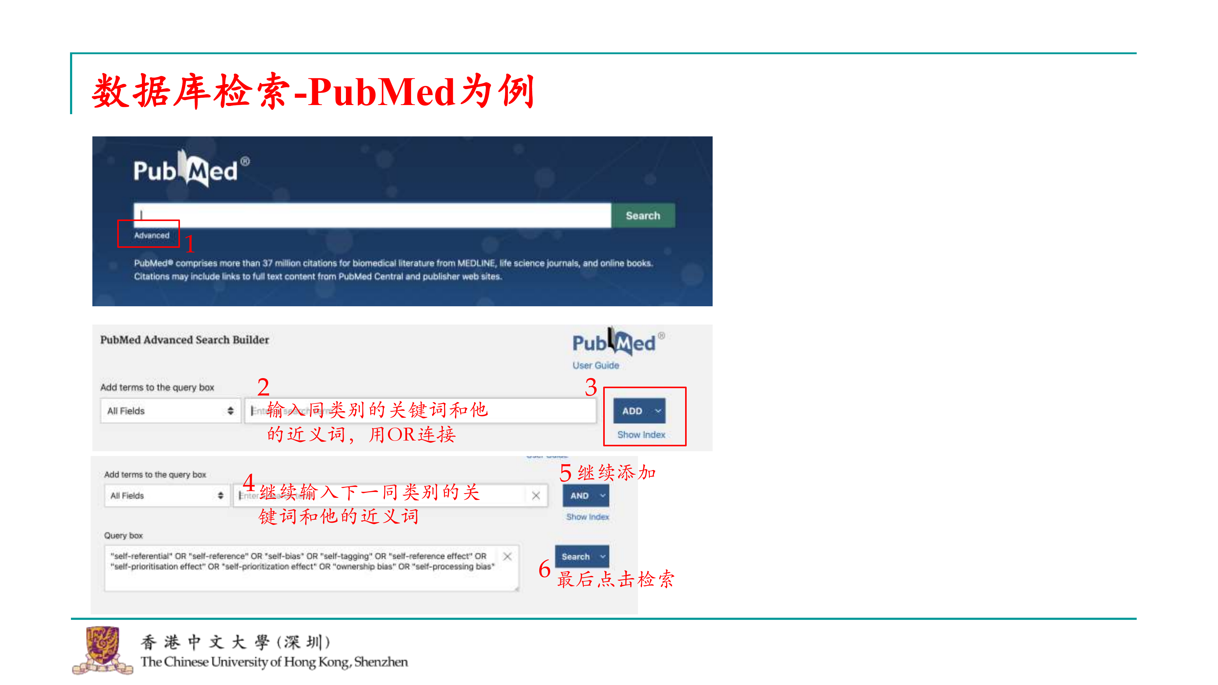 好的,接下来我们讨论如何在不同数据库中进行检索。虽然各个数据库可能有一些细微的差别,但它们的搜索结构基本上是相似的。以PubMed为例,我们可以这样进行检索: 1. 打开PubMed网站,进入搜索界面。 2. 由于我们是进行元分析,通常会使用高级搜索(advance search)选项。 3. 在高级搜索中,开始输入关键词。我们会按照类别逐个输入关键词。例如,首先输入与自我参照编码相关的关键词。 4. 在同一类别中,使用“OR”运算符将关键词连接起来,这样可以将搜索范围扩大到该类别下的所有相关内容。 5. 输入完一个类别的关键词后,点击“添加”(add),然后继续输入下一个类别的关键词,比如与学习相关的词汇。 6. 重复这个过程,直到所有相关的关键词类别都被输入并添加。 7. 最后,点击“检索”按钮,系统会显示出搜索结果。